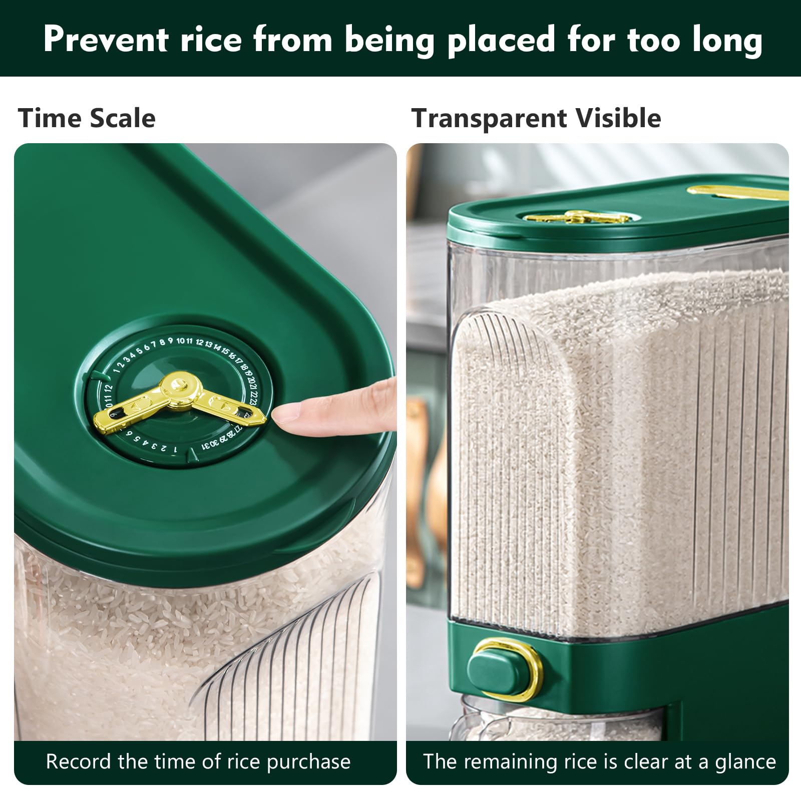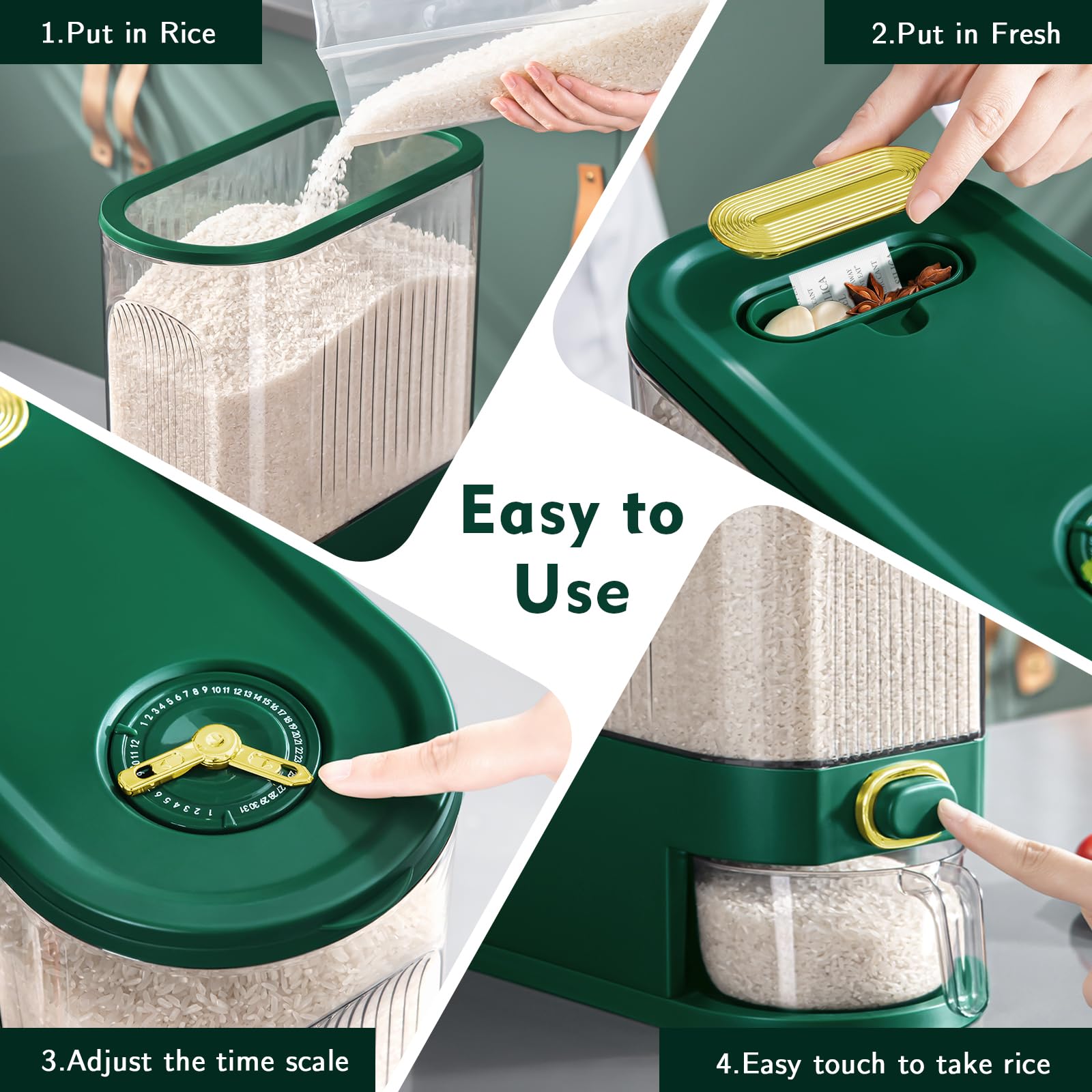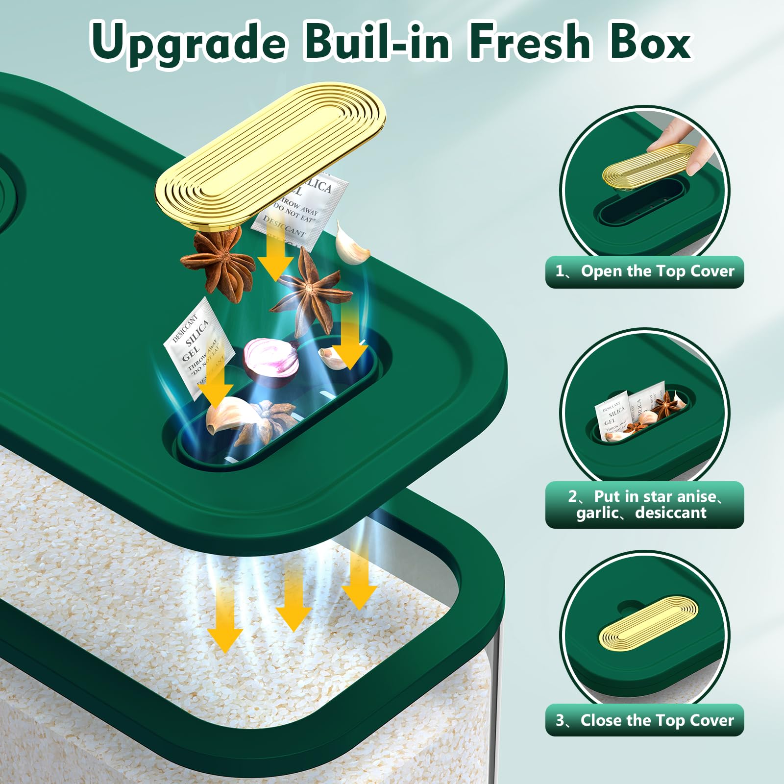 - 【Kitchen Hacks with Built-in Fresh Box】It is advised to store grains and pulses in containers in cool, dry places. But despite taking all precautions, you may still have noticed damaged and moisture crawling in them, making you repeatedly clean and rinse rice to get rid of them. At this time, you can effectively use our built-in Fresh Box to completely eliminate external infestation. Just put in some desiccant, garlic, cloves or bay leaves
