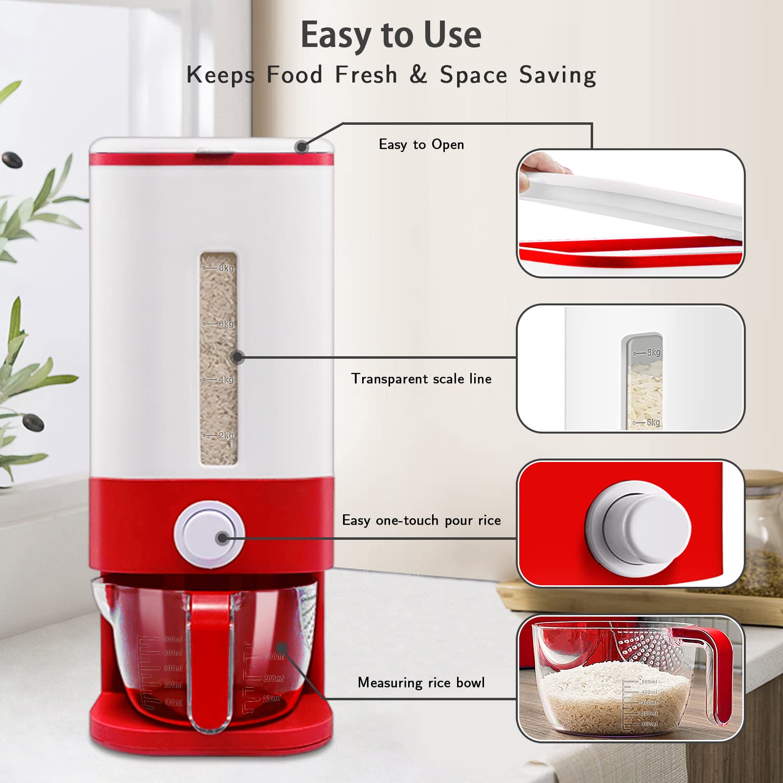 - 【Effortless Use】This Lenwi Rice Dispenser was designed with your convenience in mind. 1. transparent scale line make it easier for you to check its contents without open the lid; 2. Set the amount of rice you want for an easy one-touch button without open the lid; 3. measuring cup ensures that you are able to scoop the rice out of the container in equal amounts. And it also does not take up much space in your kitchen in case you prefer to keep it there