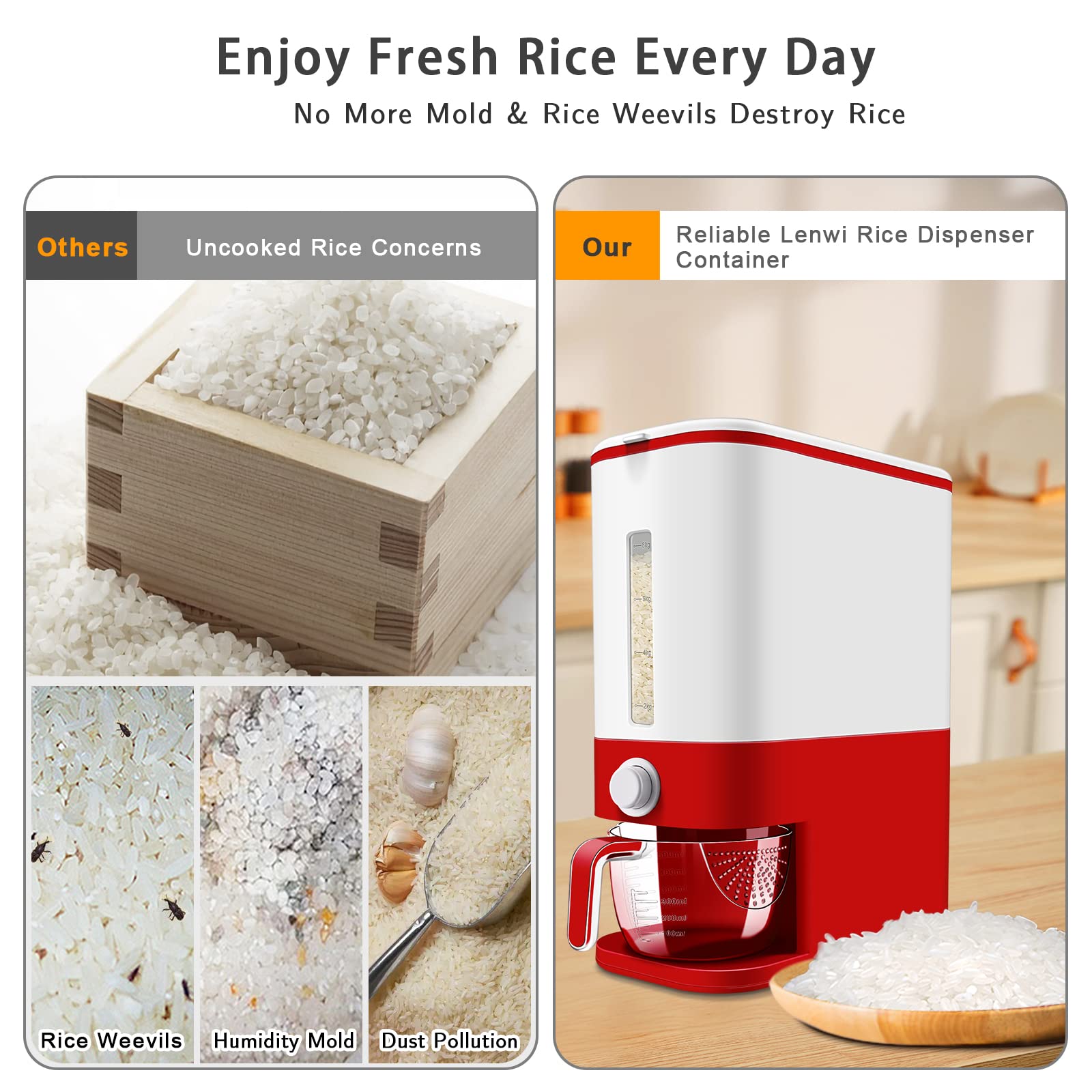 - 【BPA-Free & Food Grade Material】Lenwi rice dispenser is made from high-quality materials, BPA-free, contains no harmful substances. Making rice container durable enough for long-lasting use. Dustproof for using an extra sealing ring on the rice dispenser. This cereal storage containers are perfect for storing rice, nuts, beans, snack, cereal, pet food storage etc