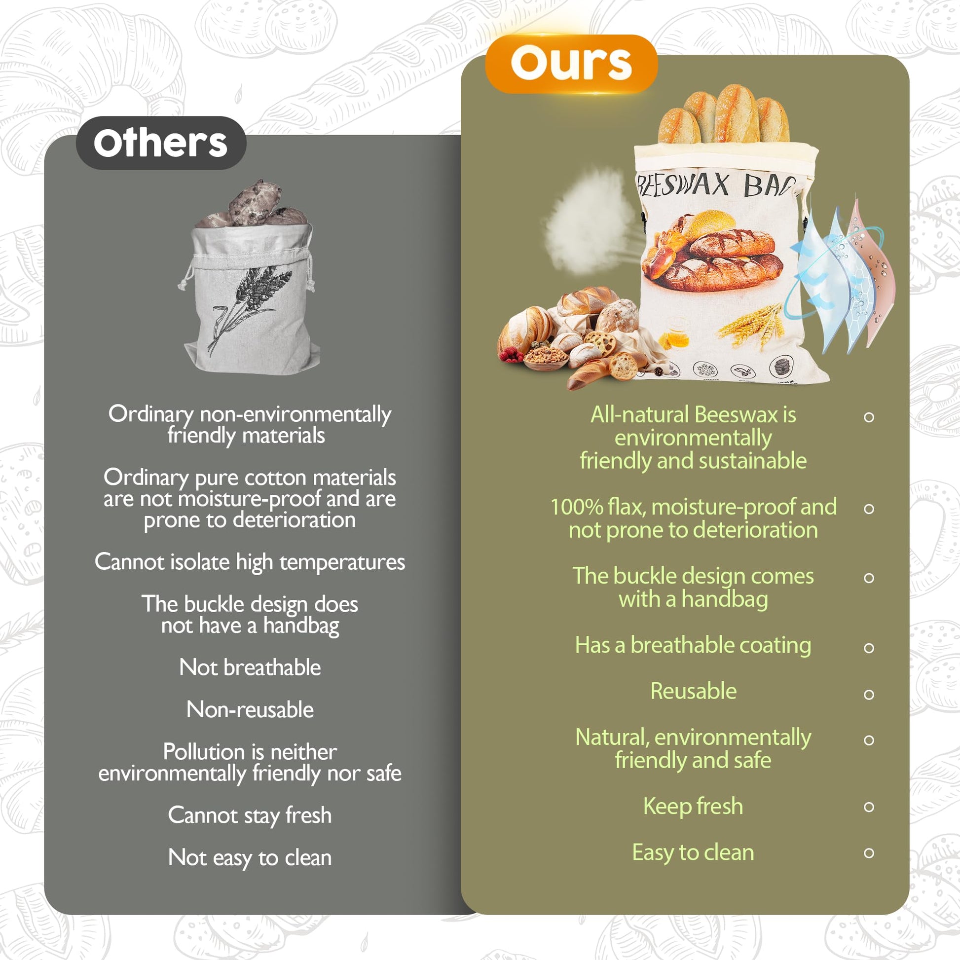 - All Natural Beeswax Blend for Long-Lasting Freshness -Beeswax Bread Bags Crafted with a blend of natural beeswax, jojoba oil, and tree resin, these 100% Linen Moisture-proof Lined bags lock in moisture to keep bread soft and flavorful. Ideal for storing sourdough, bagels, or baked goods in the freezer or refrigerator. Lightweight and portable,Designed to accommodate both small and large loaves—perfect for home, picnics, and travel