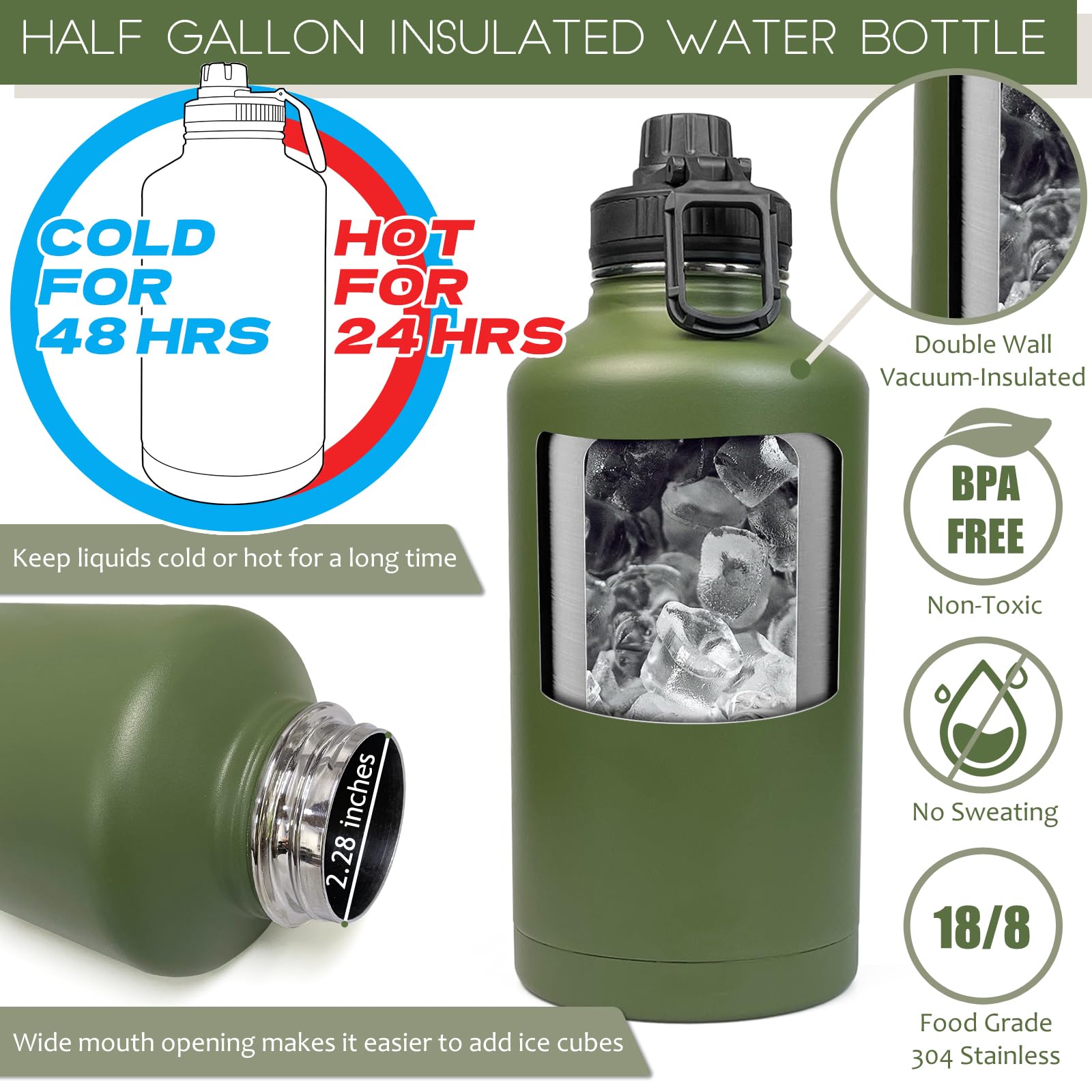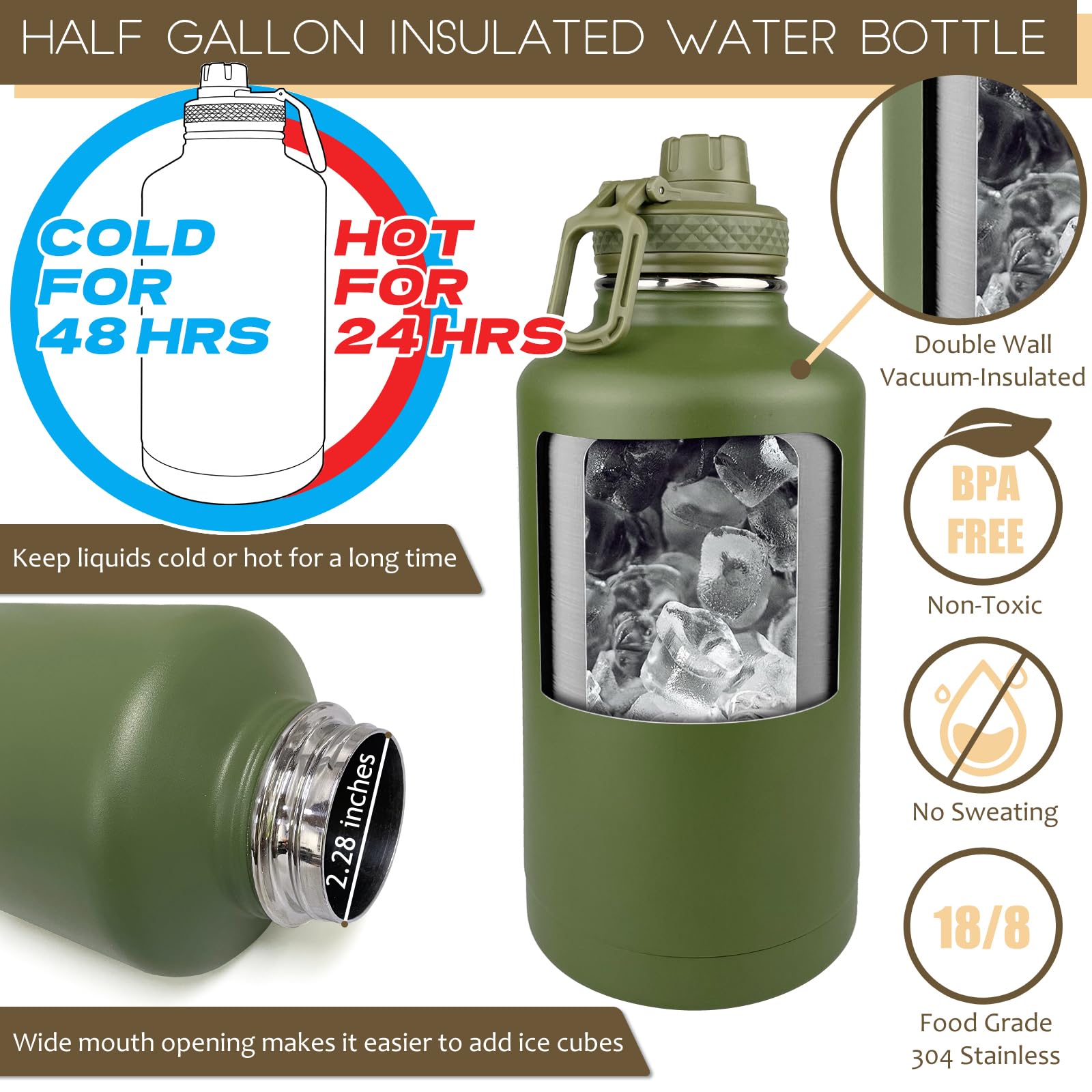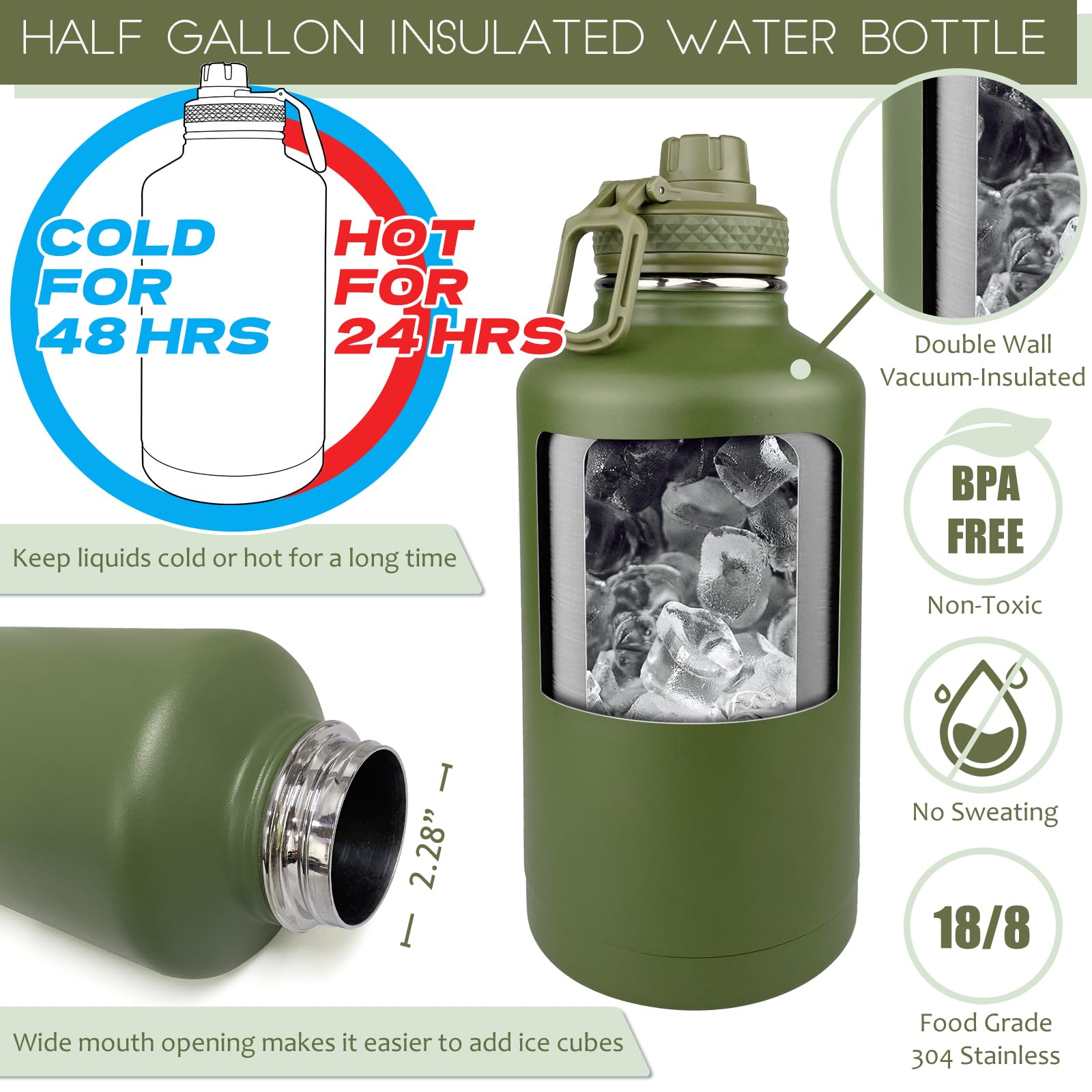 - No Sweating & Rust Resistant ◊ This metal water bottle's army green smooth outer layer is composed of 202 stainless steel, and the inner liner is composed of quality food grade 18/8 stainless steel. Compared with the plastic water bottle, this giant bottle is more solid and lasting, and will not rust or sweat.