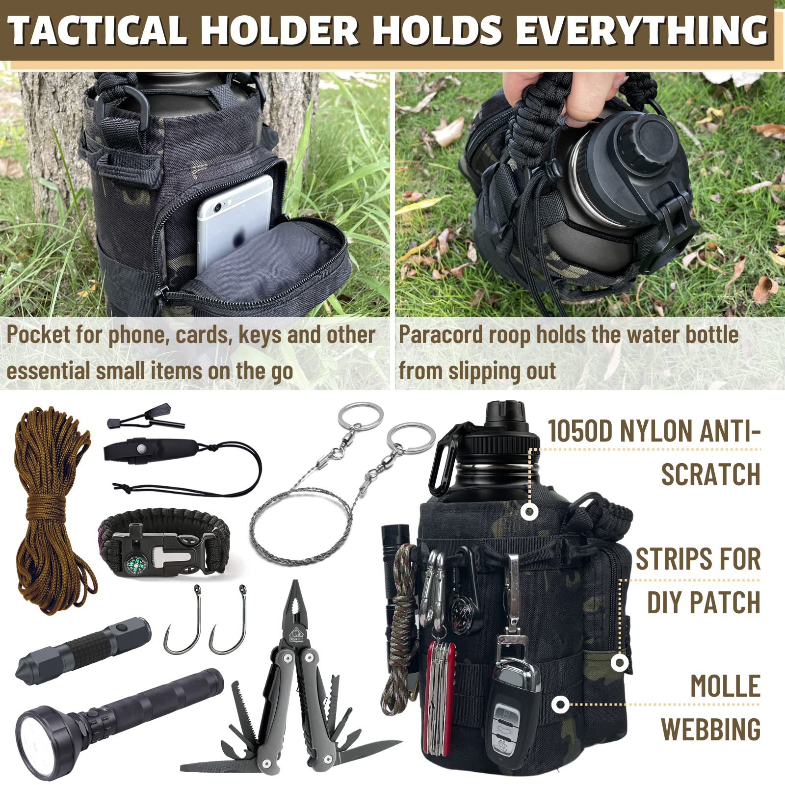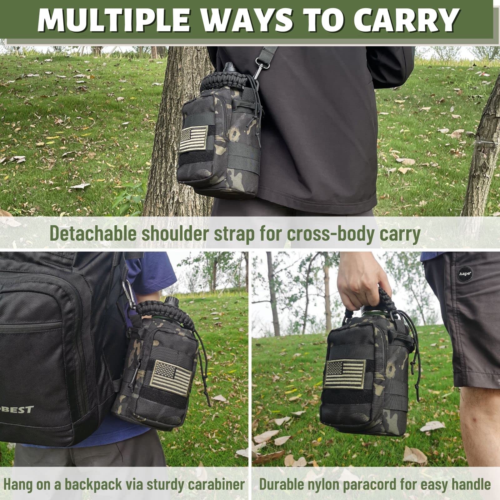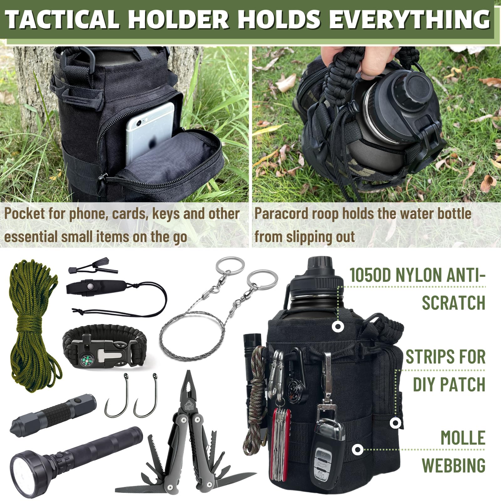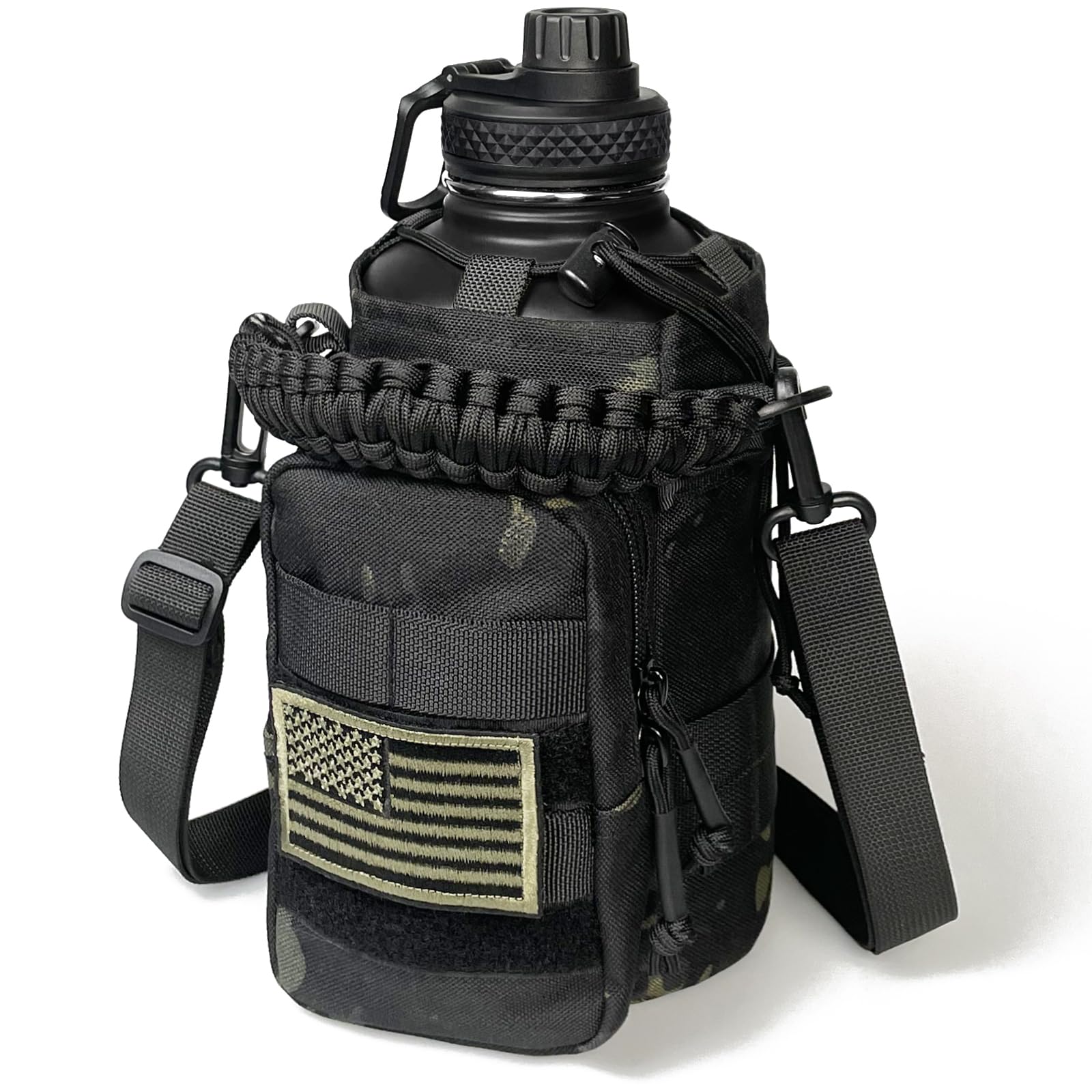 - Tactical Sports Bottle with Holder ◊ The lid with handle, the paracord handle on the water bottle sleeve, and the detachable shoulder strap provide you with a variety of carrying options and travel convenience. The front pocket can hold your cell phone, keys, and other essentials. The MOLLE system offers more possibilities to carry more things with you.