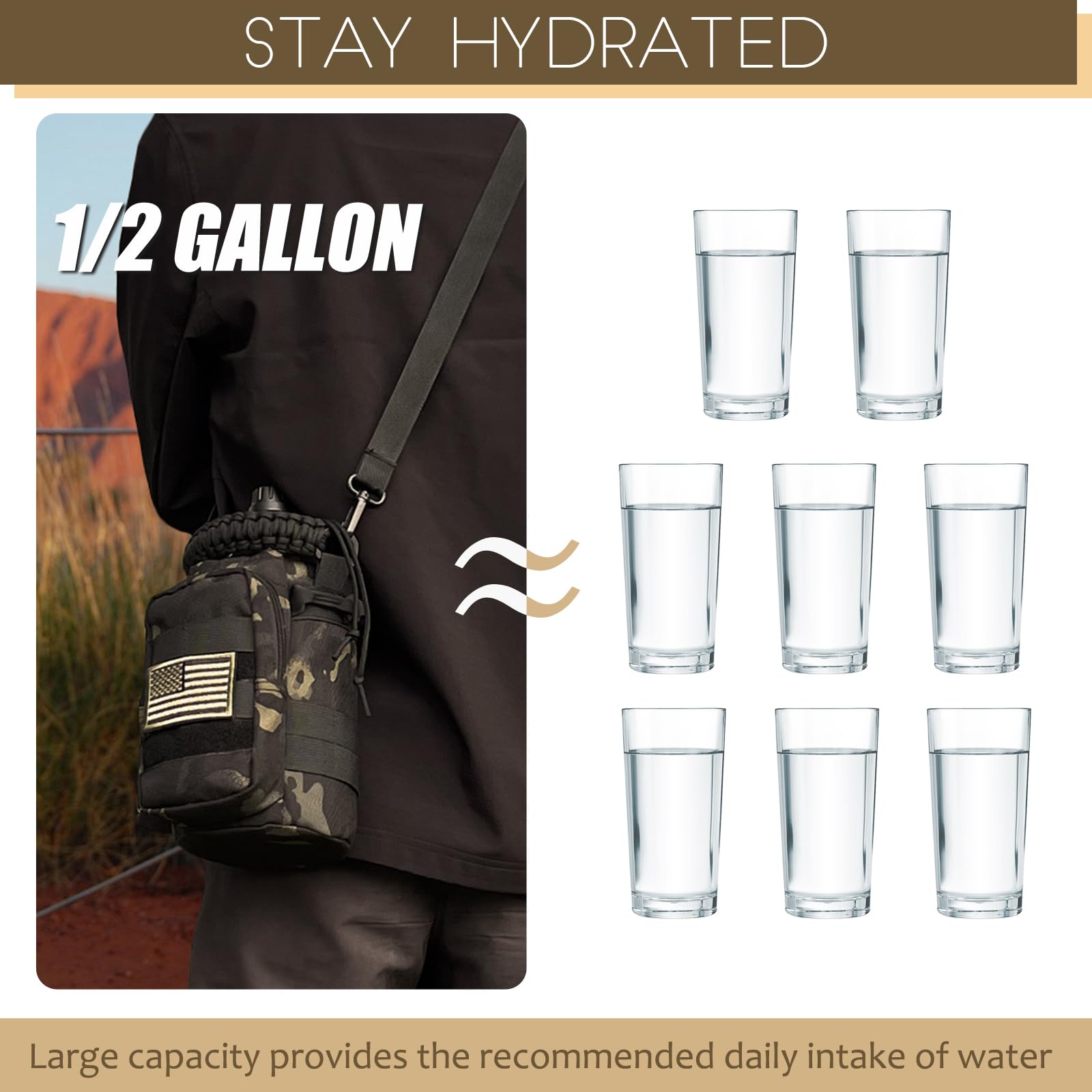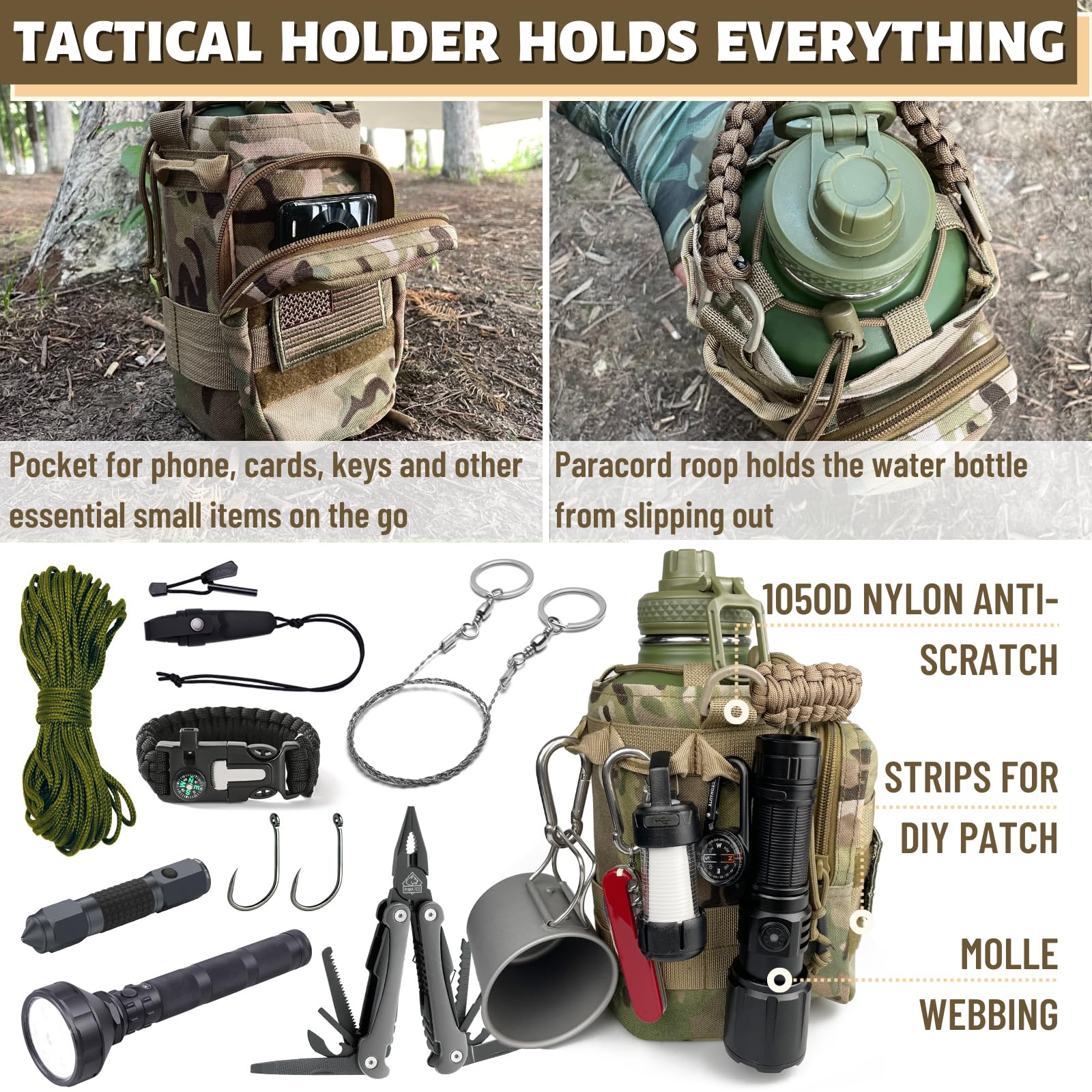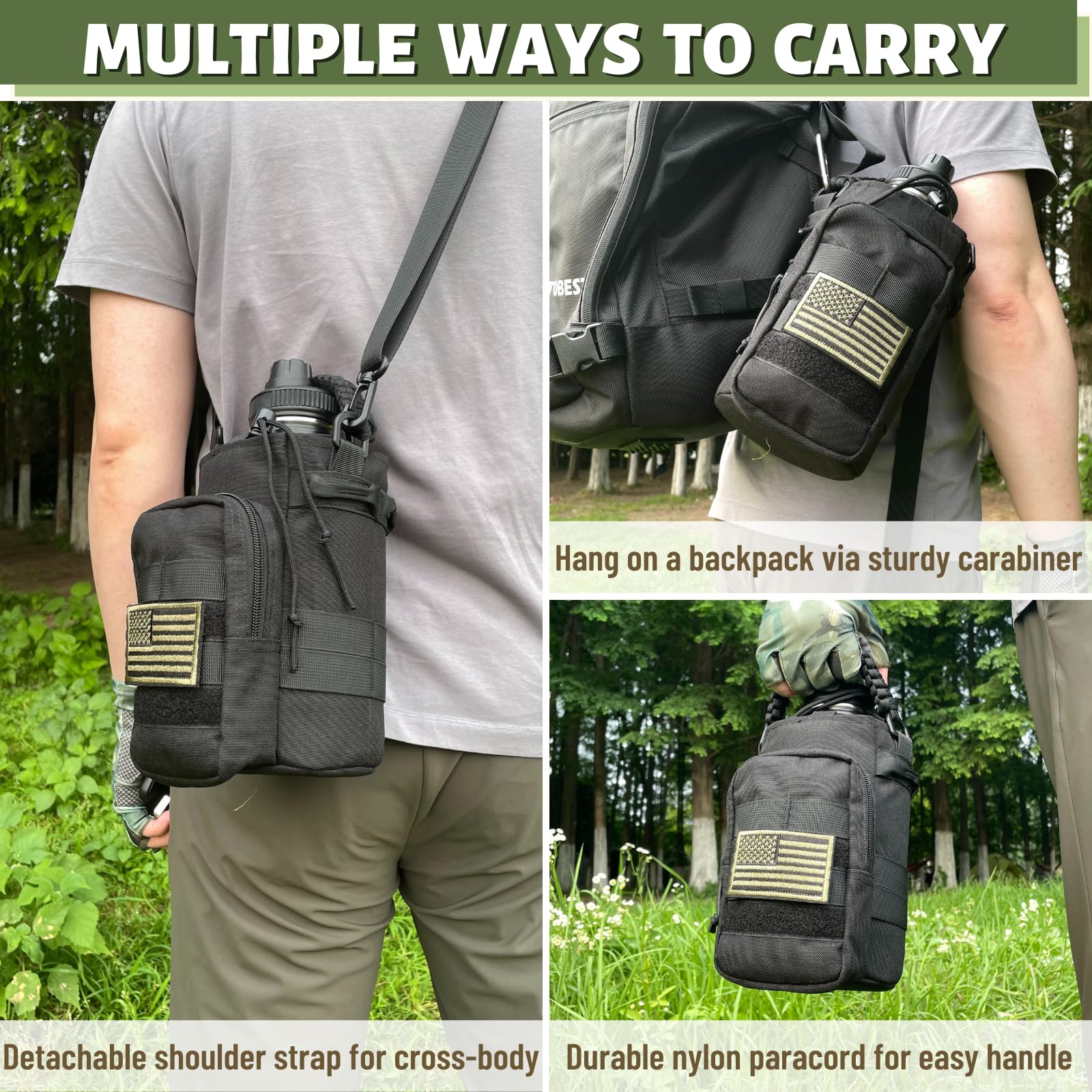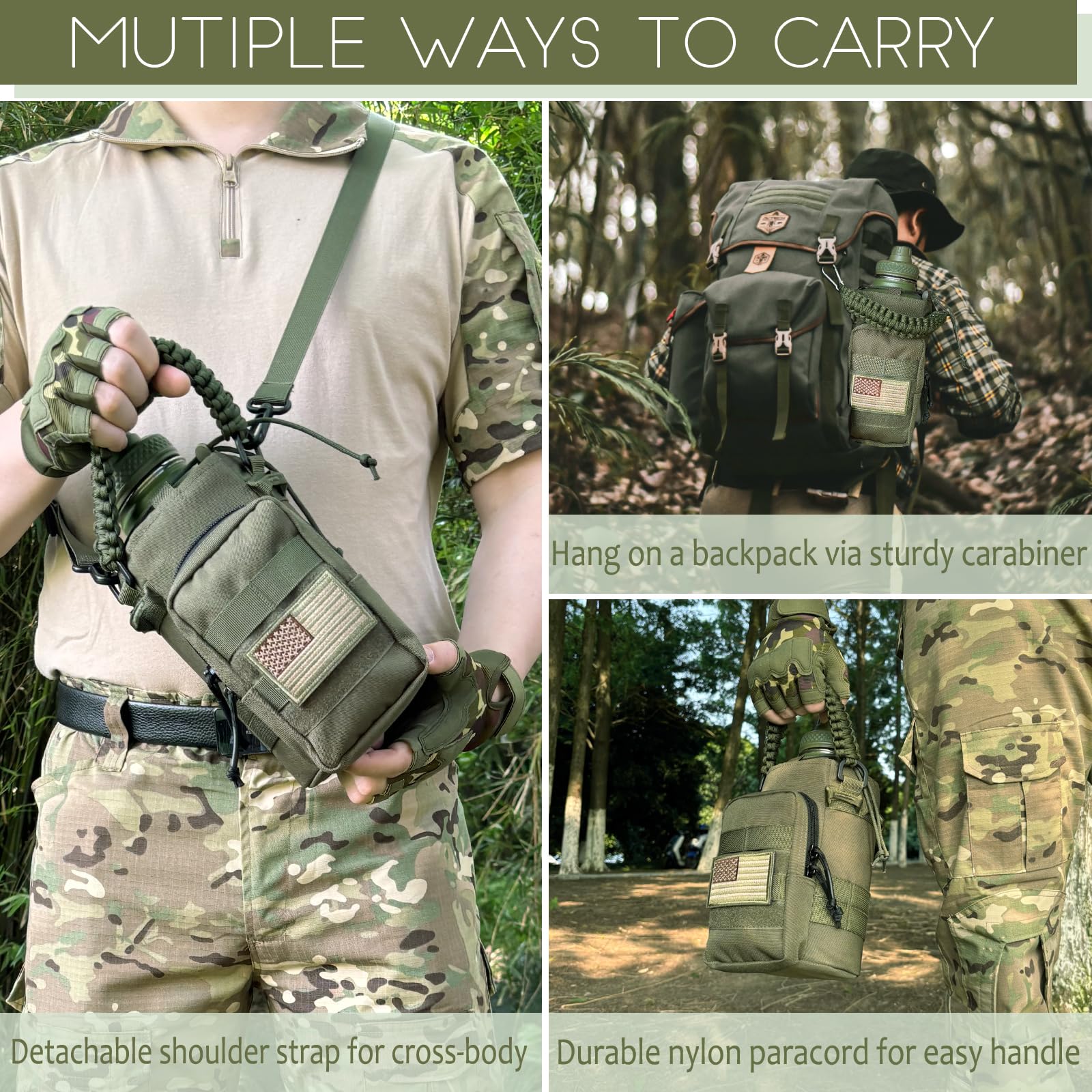 - Tactical Sports Bottle with Holder ◊ The lid with handle, the paracord handle on the water bottle sleeve, and the detachable shoulder strap provide you with a variety of carrying options and travel convenience. The front pocket can hold your cell phone, keys, and other essentials. The MOLLE system offers more possibilities to carry more things with you.