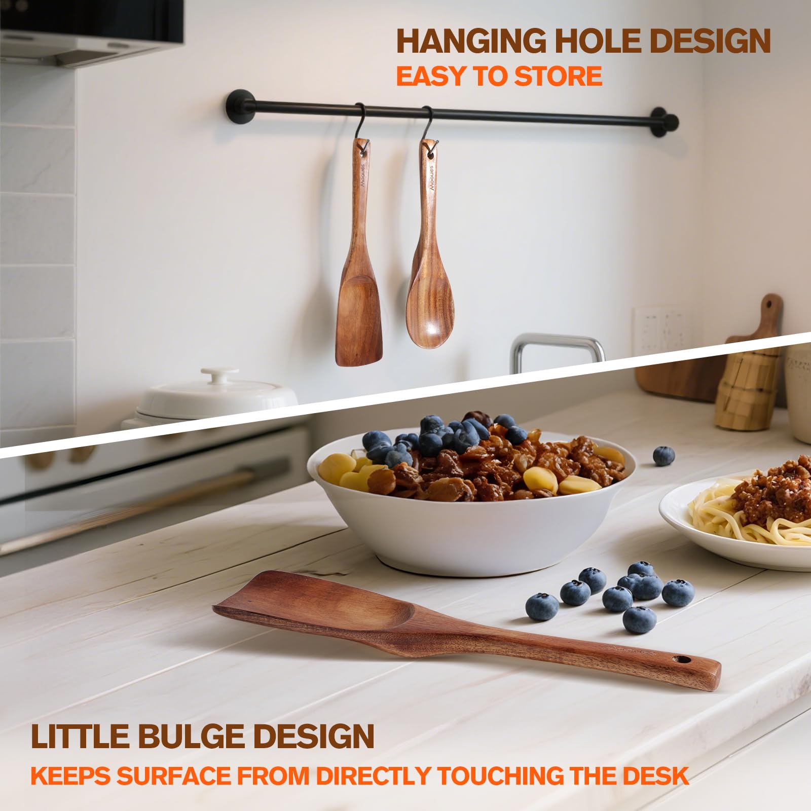 - Easy to Clean & Store: This wooden spoon set are nonstick, easy to clean with warm water or soapy water by hand, then hang it in the kitchen to dry naturally. There are holes in the handle of each appliance, you can choose to hang it or put it on the cutlery rack, which is very convenient for storage