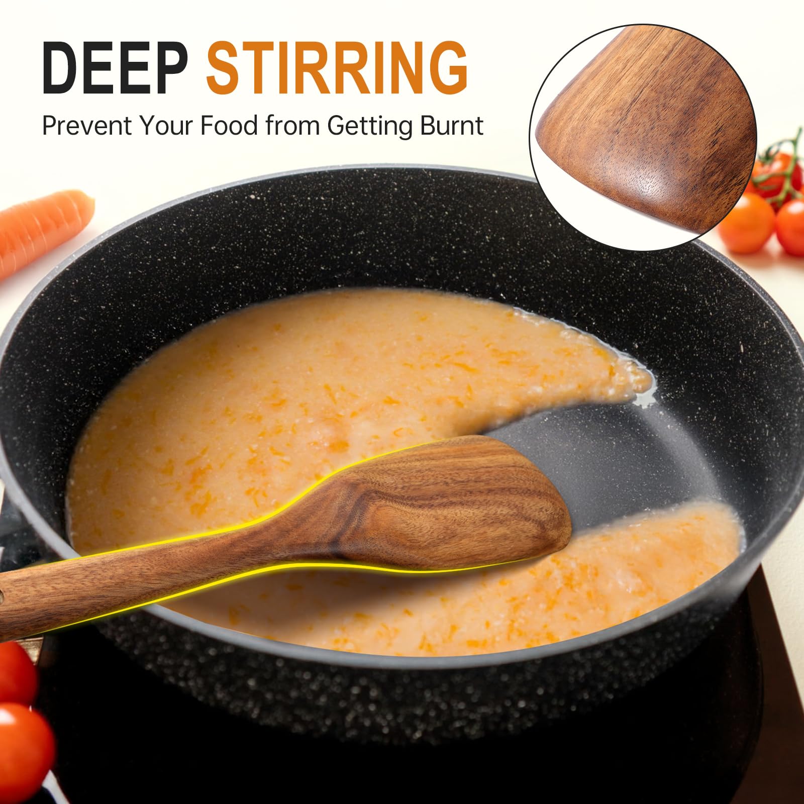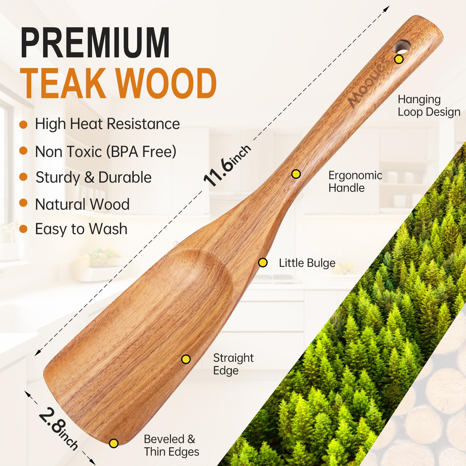- Natural Teak Wood: Our wood cooking utensils is made of natural solid teak, which is healthy and safe. Teak is densely grained, hard, and will not crack that it one of the most durable woods, stronger than silicone or bamboo. Wooden spoons are sanded by hand many times, and the surface is smooth will not hurt any cooking tools