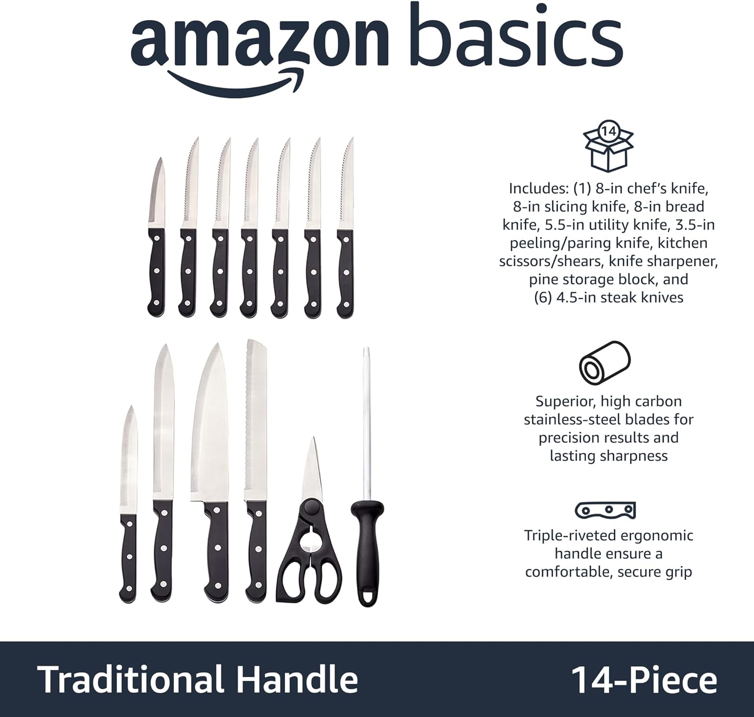 Amazon Basics 14-Piece High Carbon Stainless Steel Kitchen Knife Set with Sharpener and Pinewood Block, Black