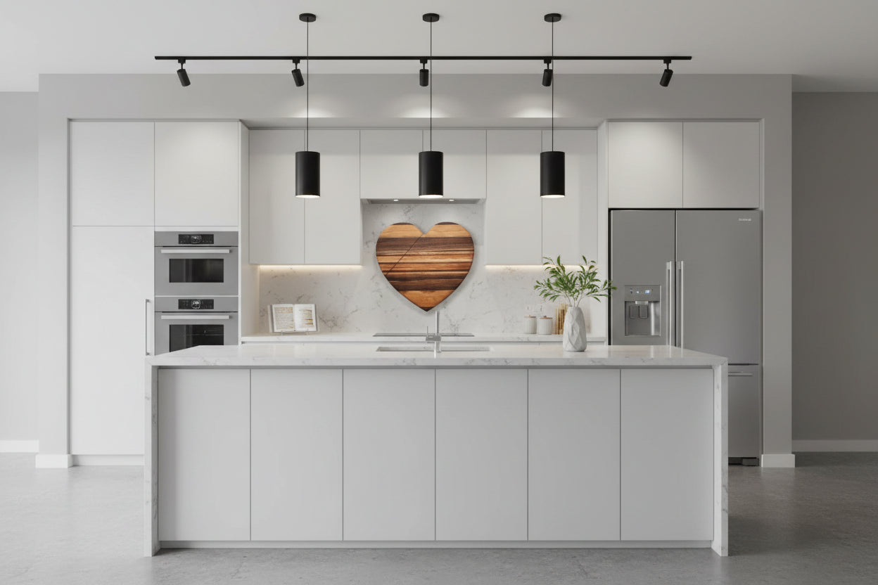 A handcrafted piece made to celebrate warmth, color, and craftsmanship. This 12" x 0.75" heart‑shaped cutting board blends four stunning hardwoods — ambrosia maple, cherry, purpleheart, and black walnut — into a romantic, functional work of art.