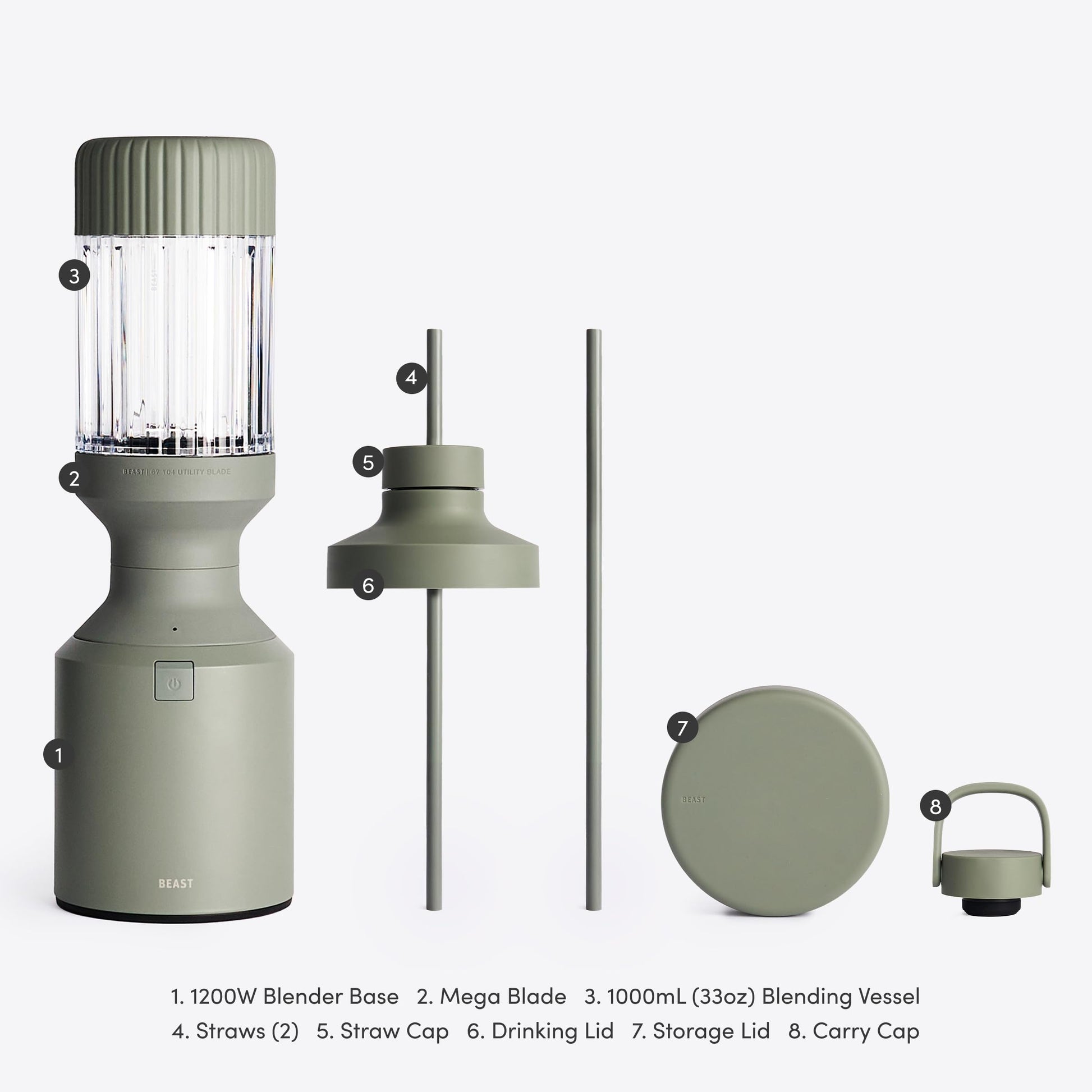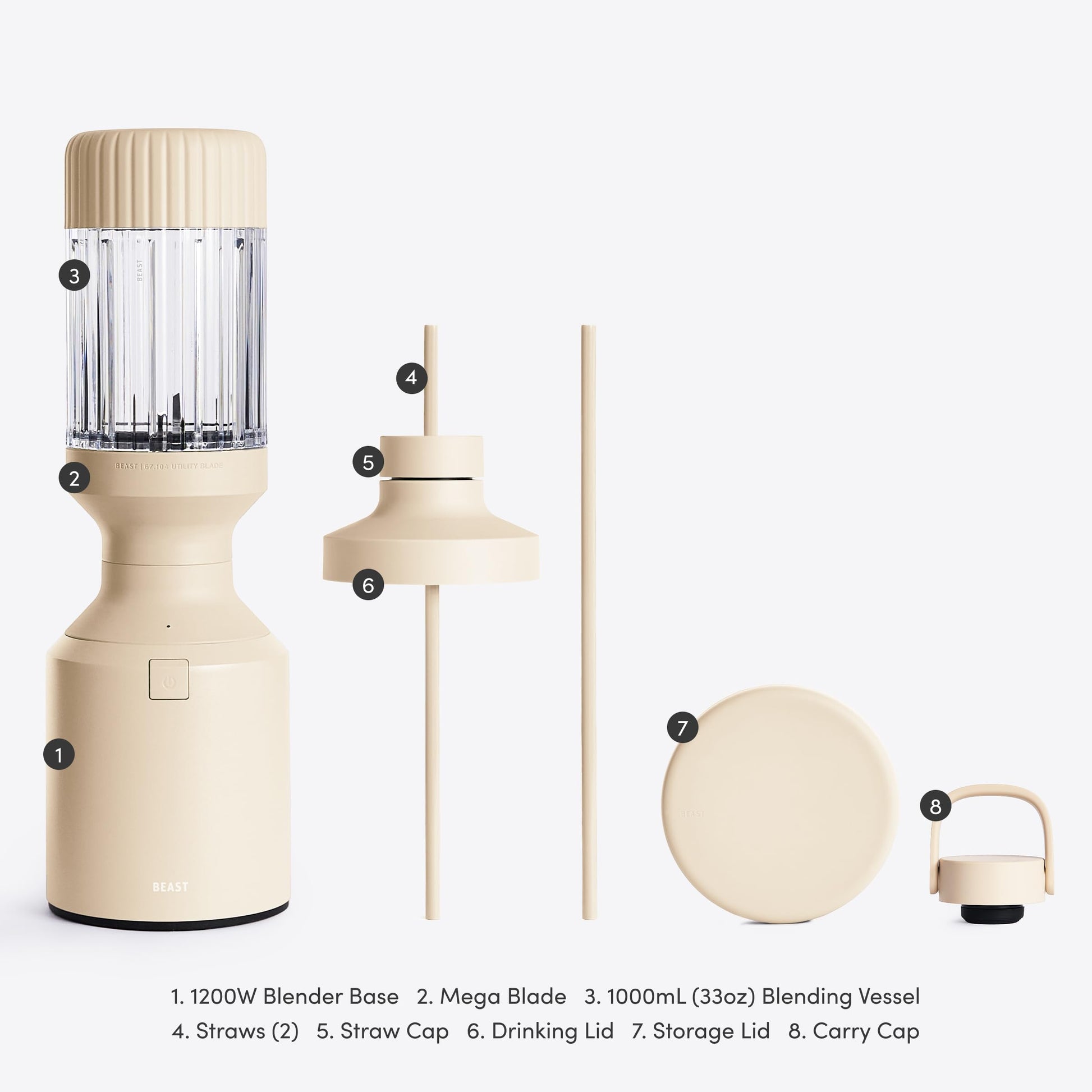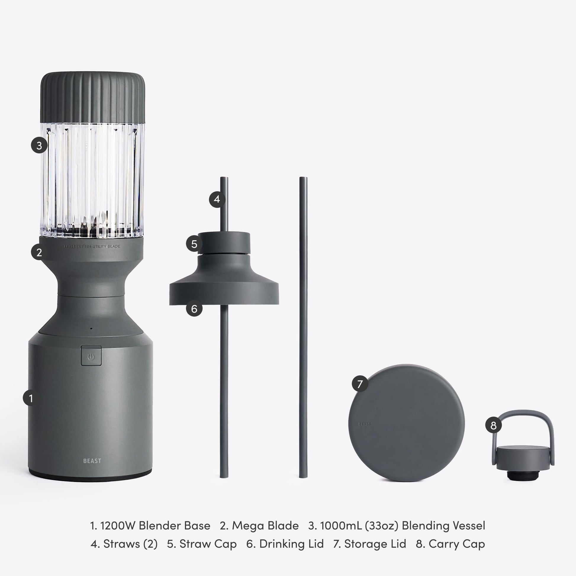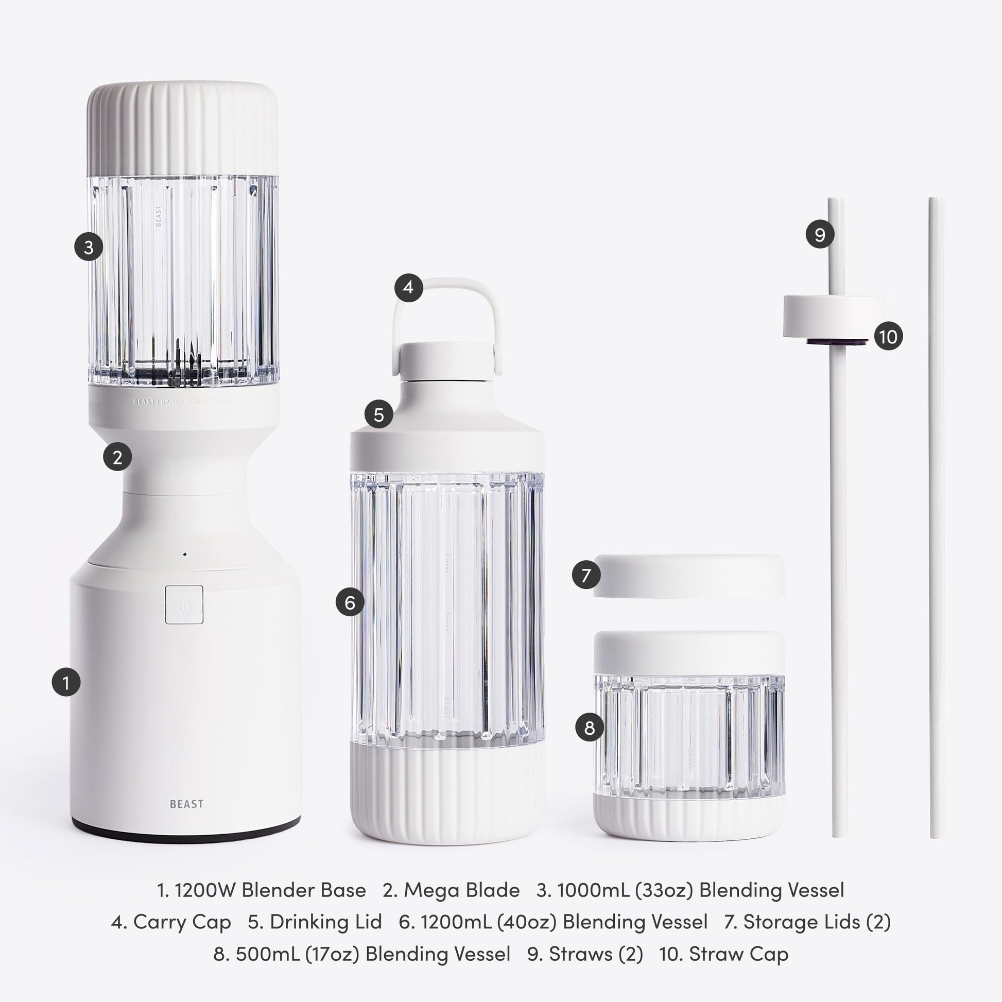 - WHAT'S INCLUDED: 1200W Motor Blender Base, Beast Mega Blade, 3x Blending Vessels (1200mL, 1000mL, and 500mL), 2x Storage Lids, Drinking Lid, Carry Cap, Straw Cap, 2x Straws. Designed for 120V use only.