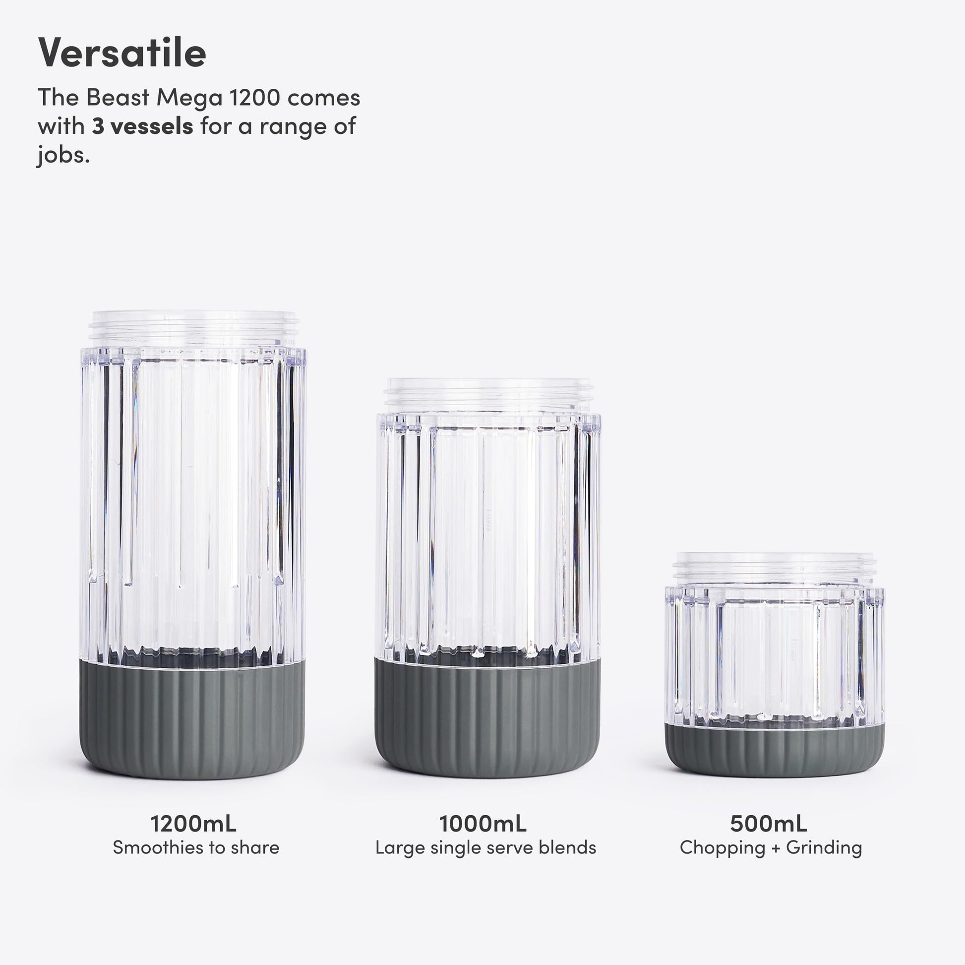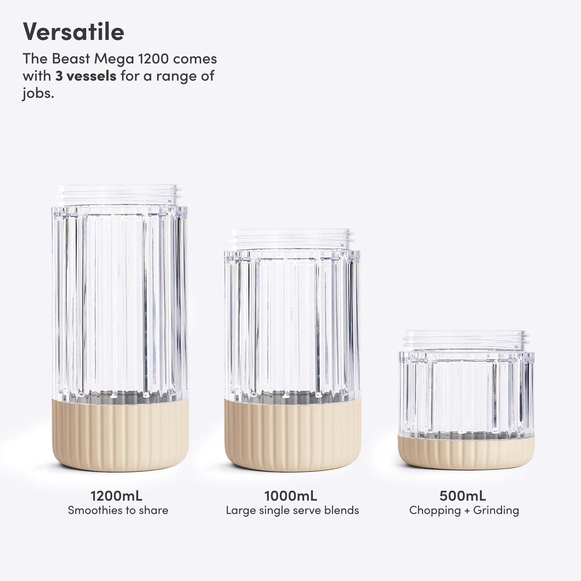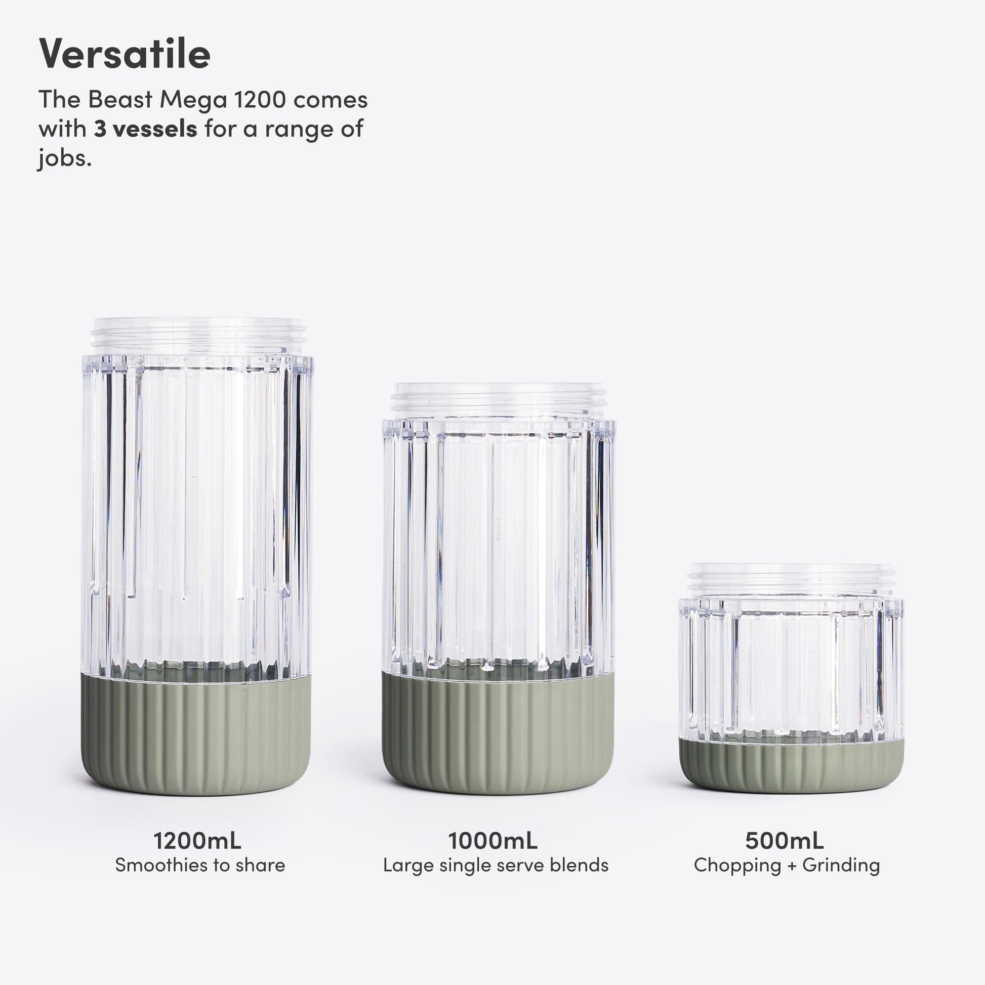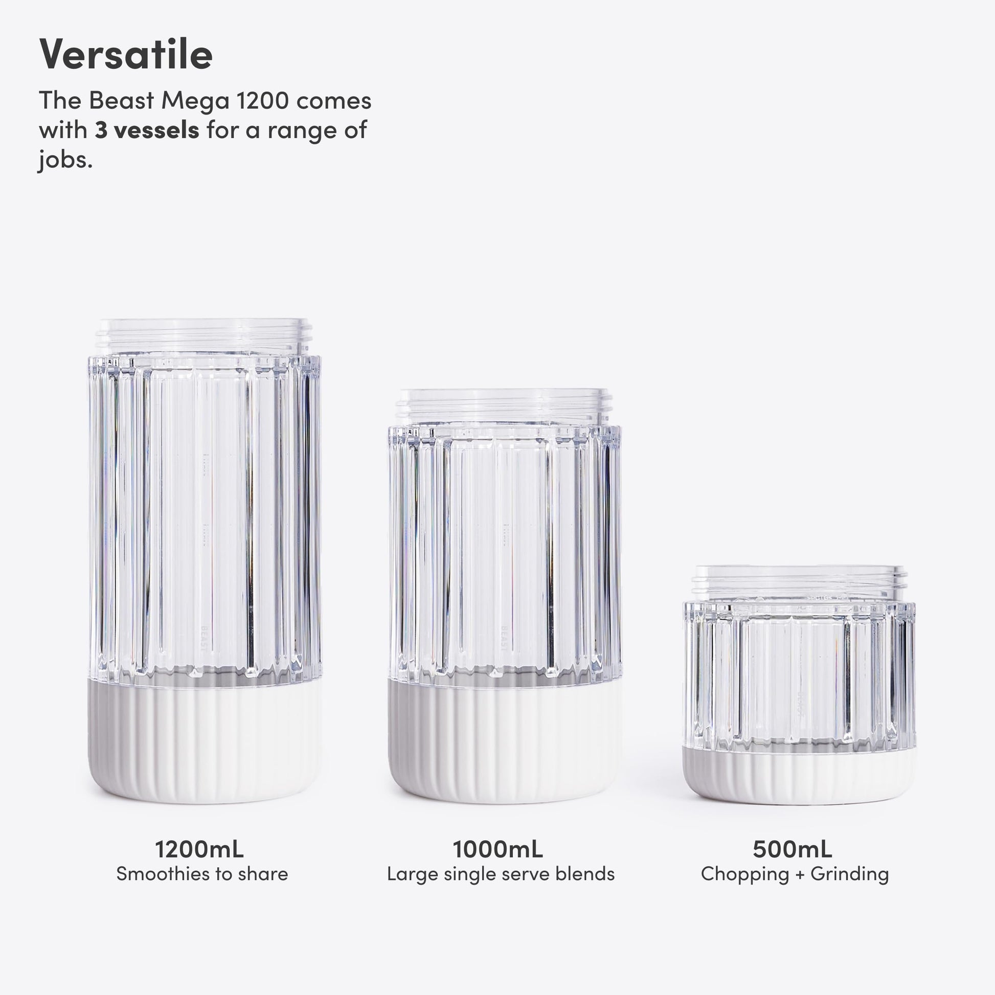 - WHAT'S INCLUDED: 1200W Motor Blender Base, Beast Mega Blade, 3x Blending Vessels (1200mL, 1000mL, and 500mL), 2x Storage Lids, Drinking Lid, Carry Cap, Straw Cap, 2x Straws. Designed for 120V use only.