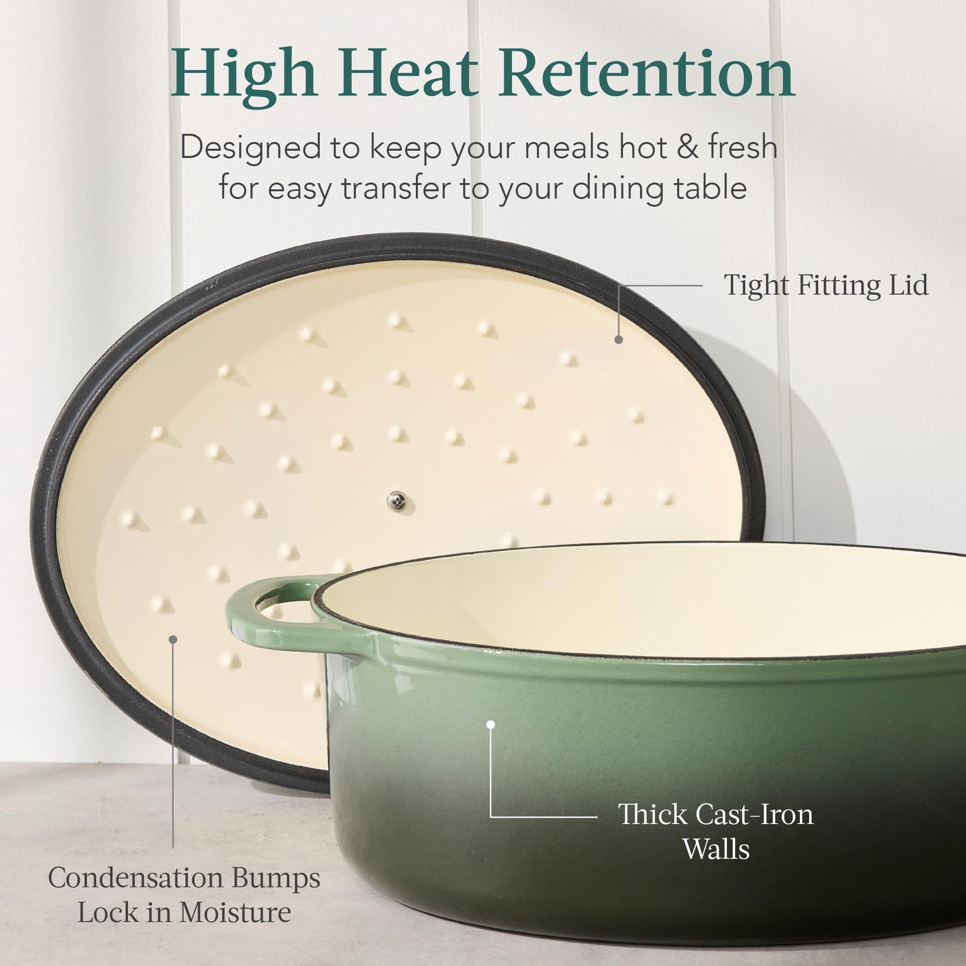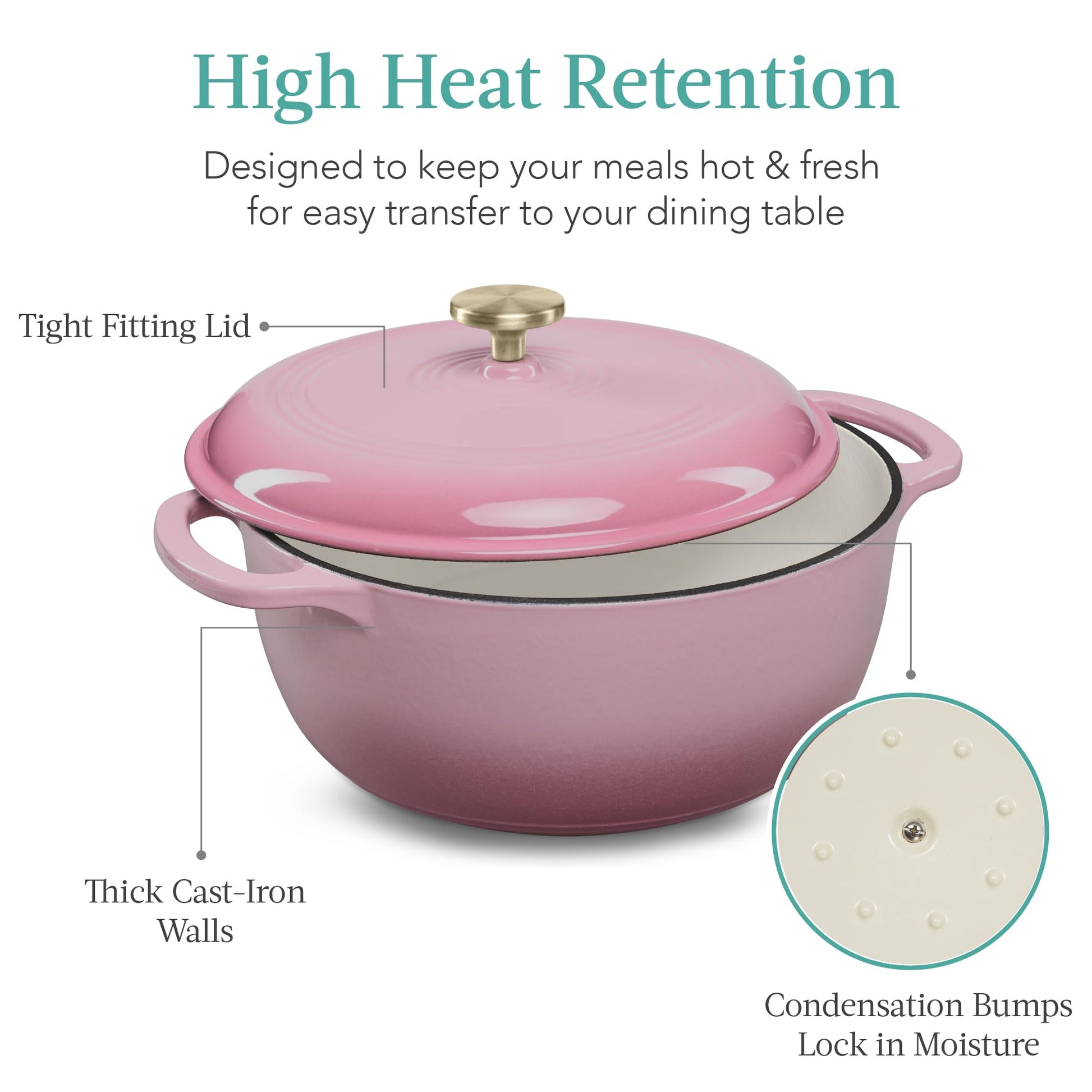 - HIGH HEAT RETENTION: Built to reach and maintain temperatures up to 480 degrees Fahrenheit, a set of condensation bumps on the heavy lid helps seal in moisture, heat, and flavor