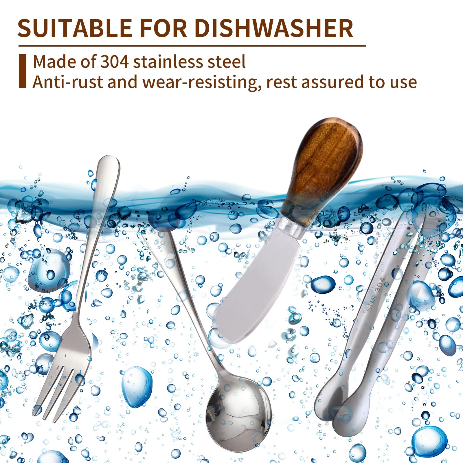 - 【High-Quality Materials】 The cheese knife set features natural wood handles and stainless steel blades. Ergonomically designed for comfortable grip, the smooth blades aid in slicing and spreading butter. The spoons, forks, and mini tongs are all made of 304 stainless steel, durable and resistant to bending, oxidation, and rust, suitable for various kitchen styles