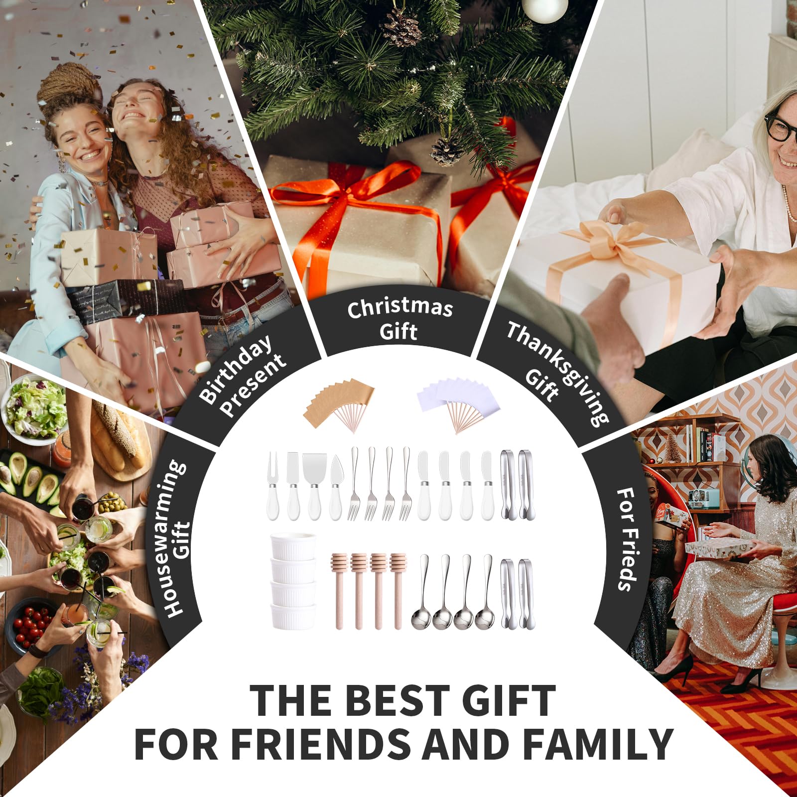 - 【What You'll Receive】 You'll get 8x wooden-handle cheese spreader knives, 4 x charcuterie bowls, 4 x mini forks, 4 x mini spoons, 4 x mini tongs, 4 x wooden honey dippers, 20 x white blank flag cheese markers, and craft paper blank flag cheese markers