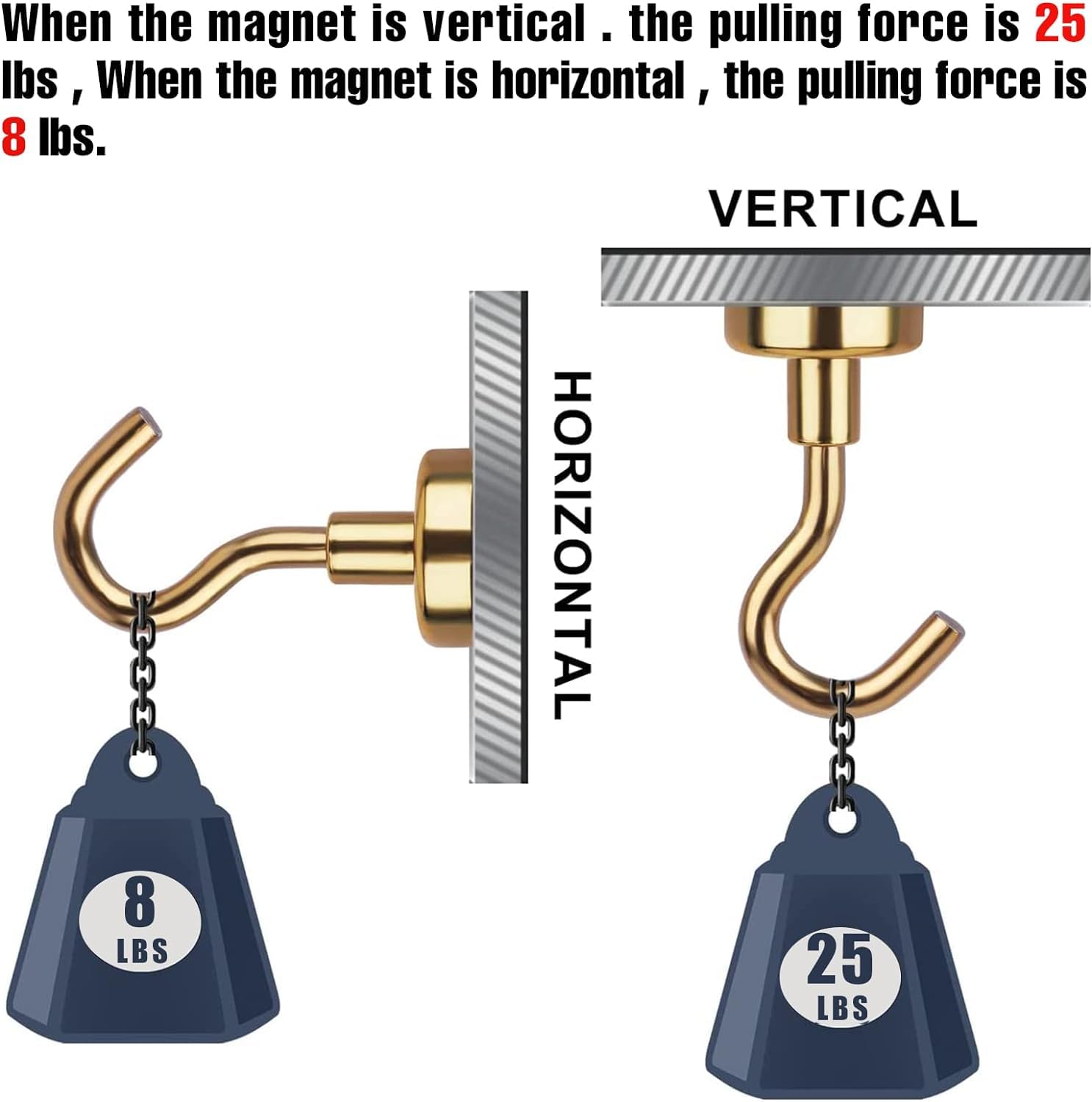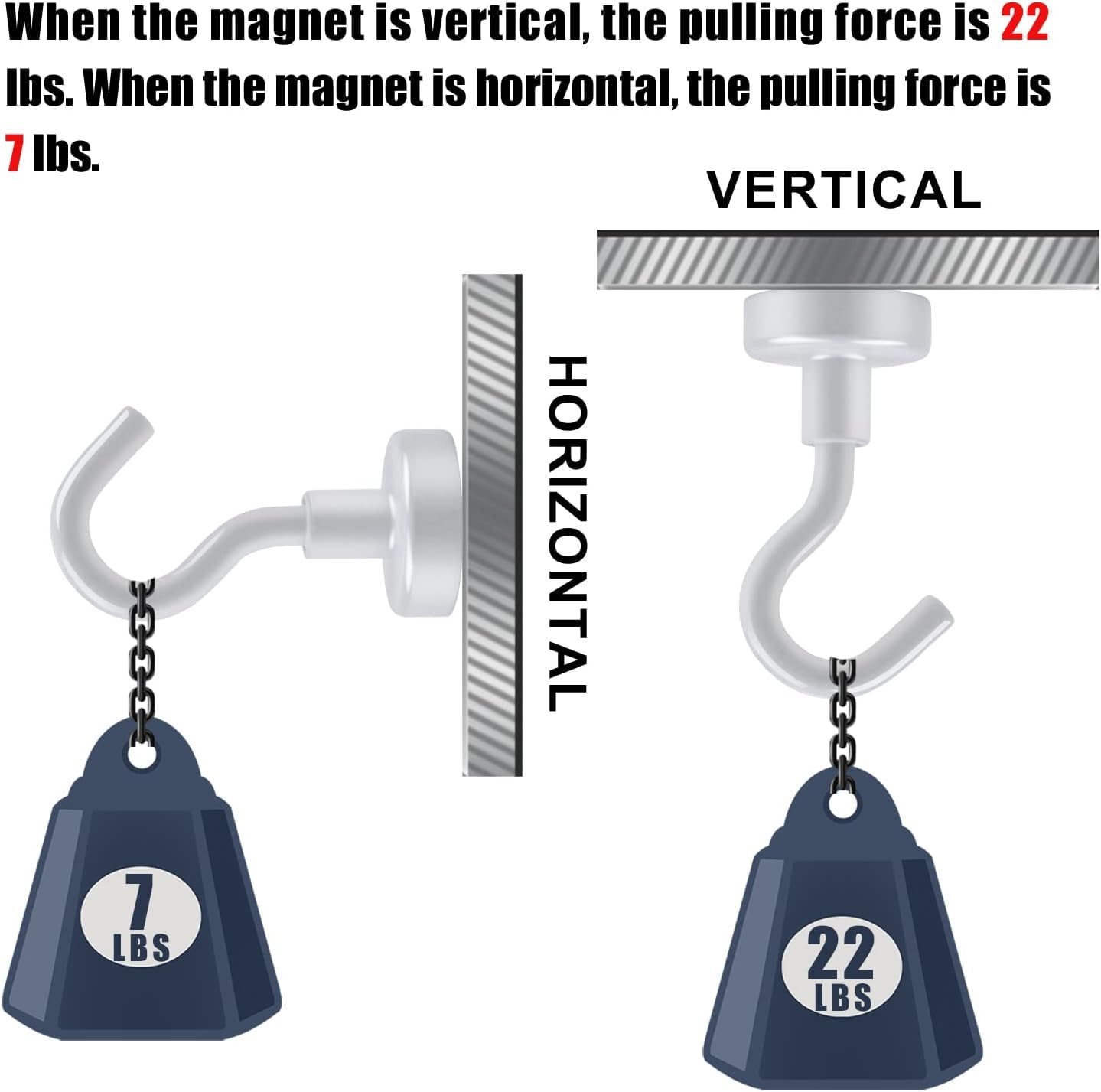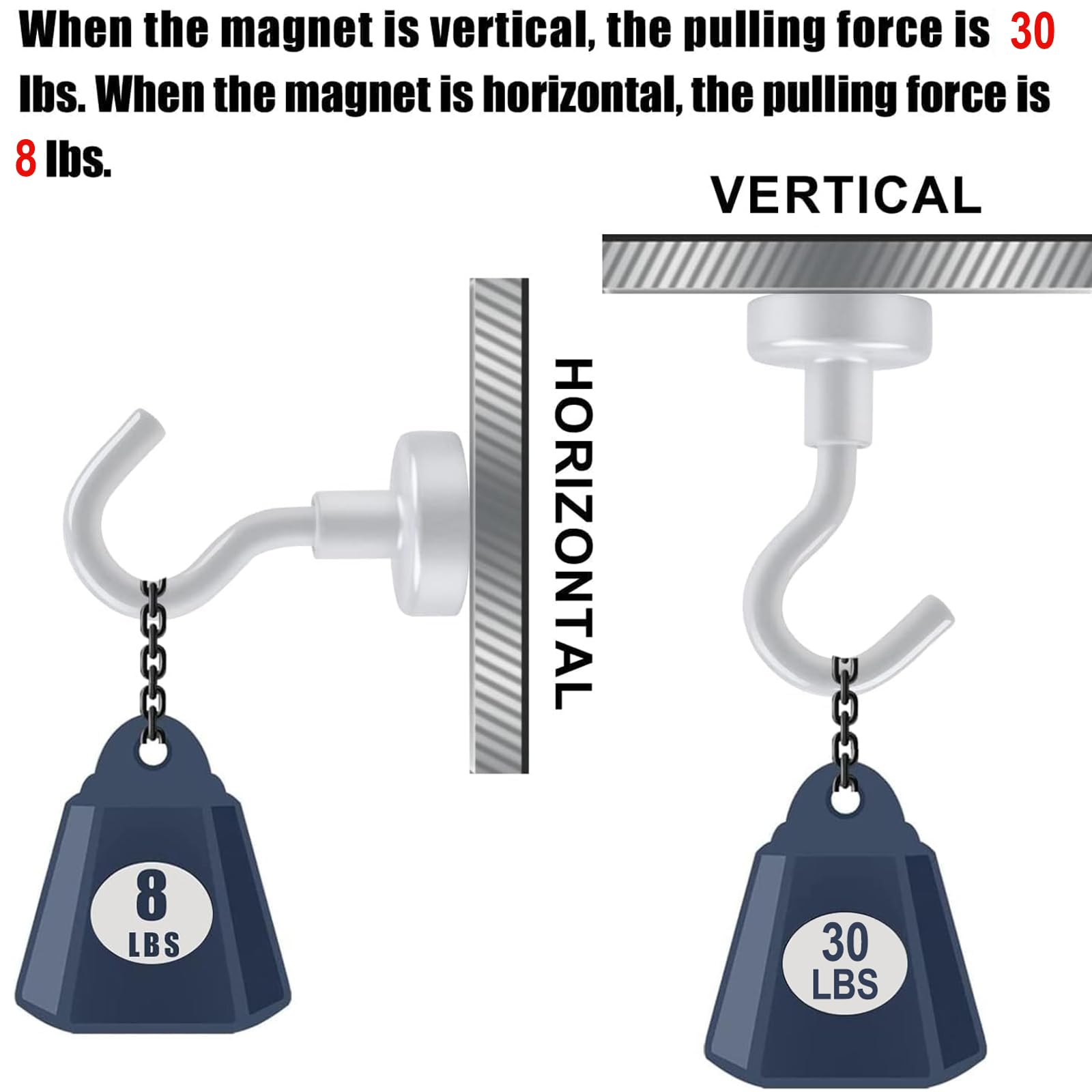 - Tips:Please make sure that the adsorption surface is iron-containing and smooth. Otherwise, it will affect the magnetic strength. In addition, 30LBS magnetic hooks tension is based on the direction of tension perpendicular to the contact surface - if used horizontally, reduce by 2/3, if you need to hang slightly heavier items, you can choose to hang them vertically. If you can't hang them vertically, please use more magnetic hooks to hang them together