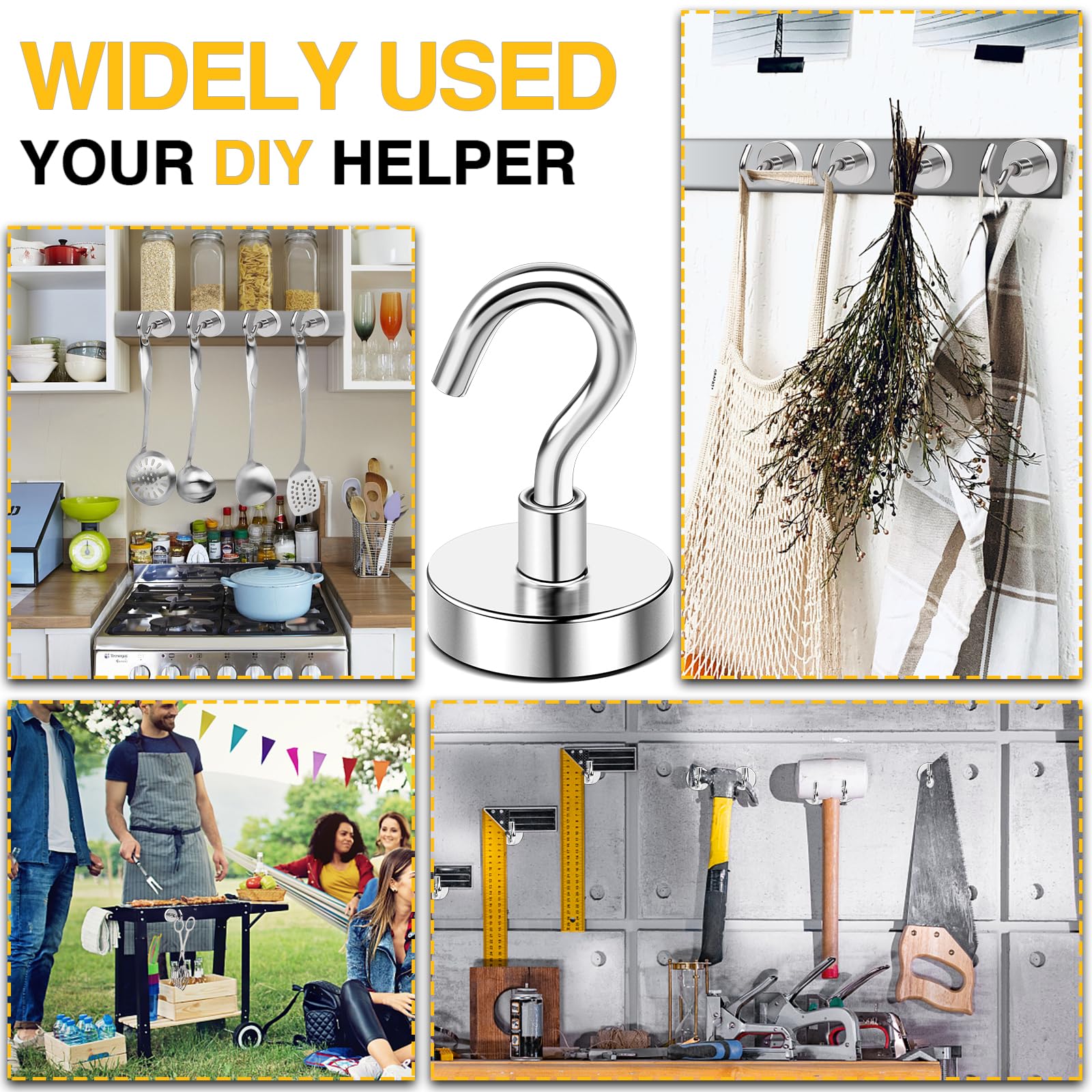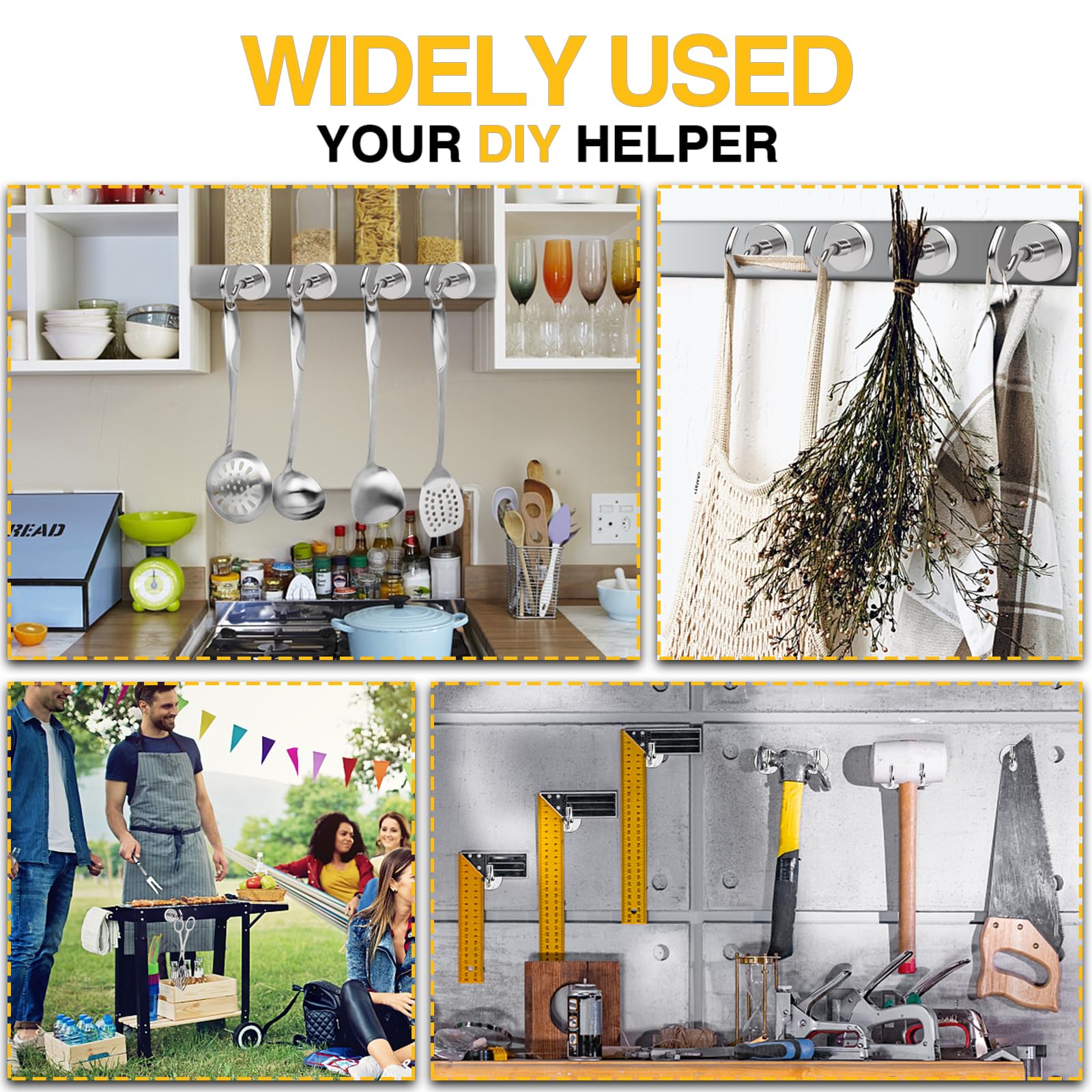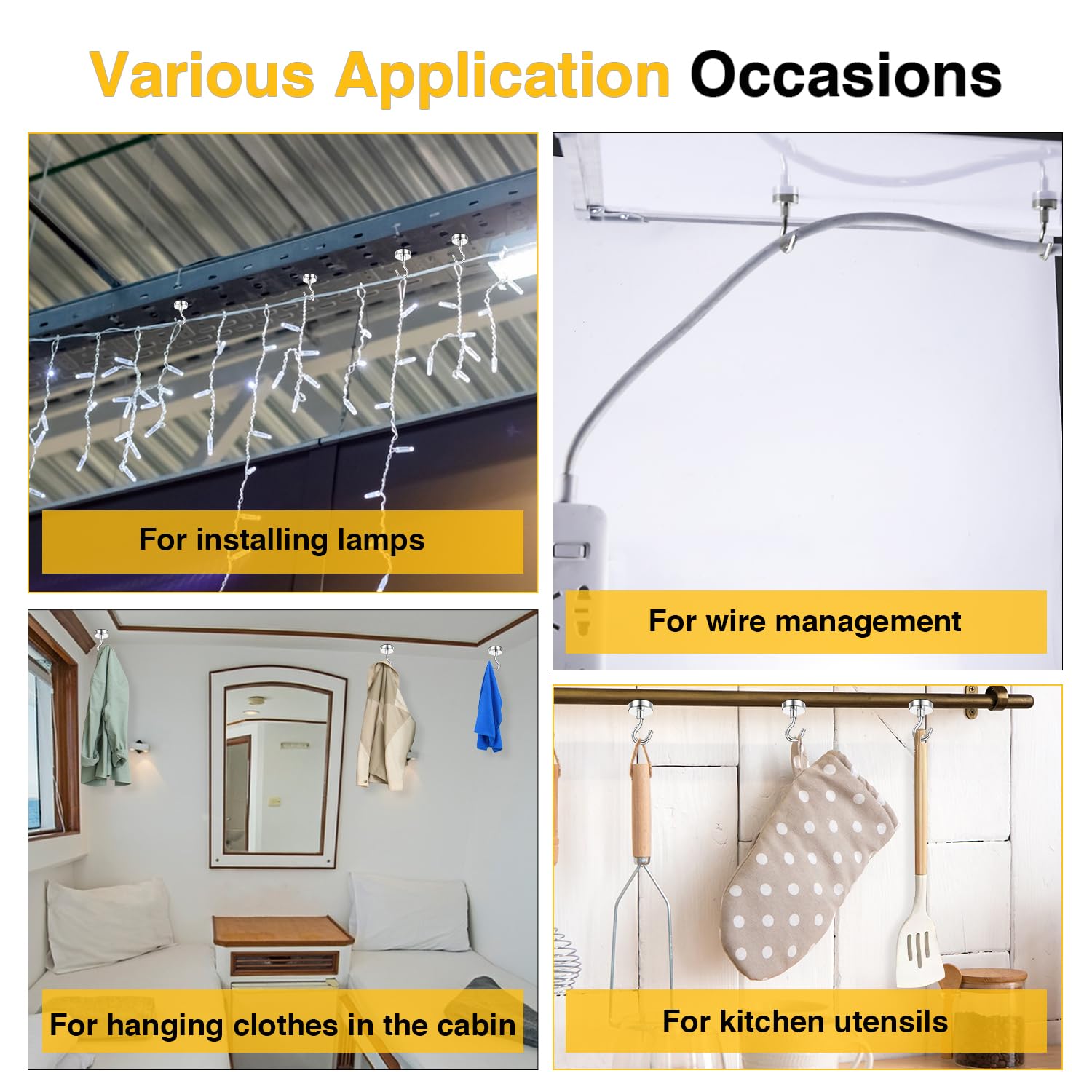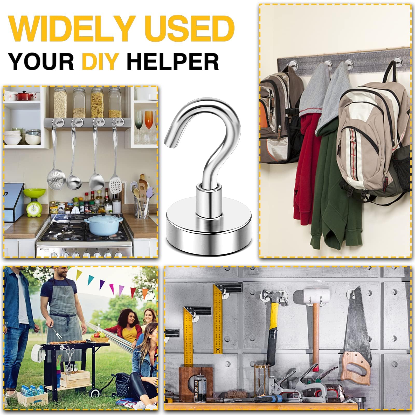 - Can Be Used Anywhere:Our strong magnetic hooks can be used to hang items anywhere there is steel or iron. It can be used to hang kitchen utensil, to hang keys, backpacks, and clothes on the door, to hang various tools in the warehouse, to hang light bulbs on the roof, and to hang them on the barbecue grill, classroom, refrigerator, bathroom, and anywhere there is iron