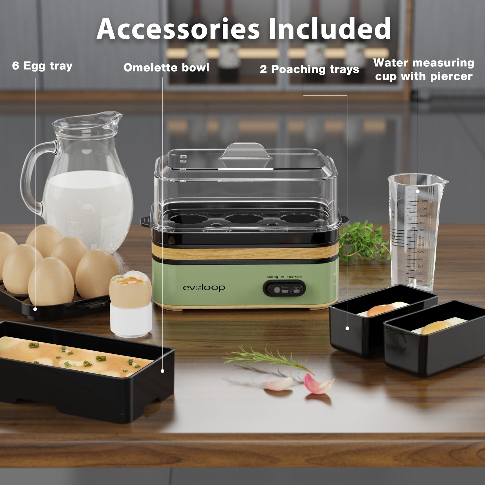Evoloop Rapid Egg Cooker Electric 6 Eggs Capacity, Soft, Medium, Hard Boiled, Poacher, Omelet Maker Egg Poacher With Auto Shut-Off, BPA Free