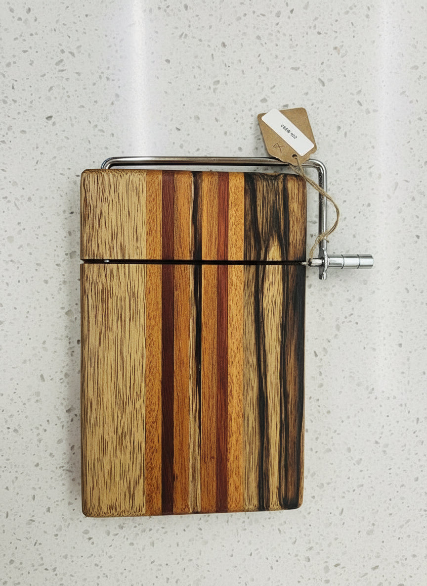 Elevate your charcuterie experience with this handmade cheese slicer, crafted from a striking trio of black limba, Honduran mahogany, and padauk hardwoods. Measuring 6" x 9" x 3/4", this slicer is fitted with a durable stainless steel slicing arm and wire, designed to deliver smooth, precise cuts through soft and semi‑hard cheeses.