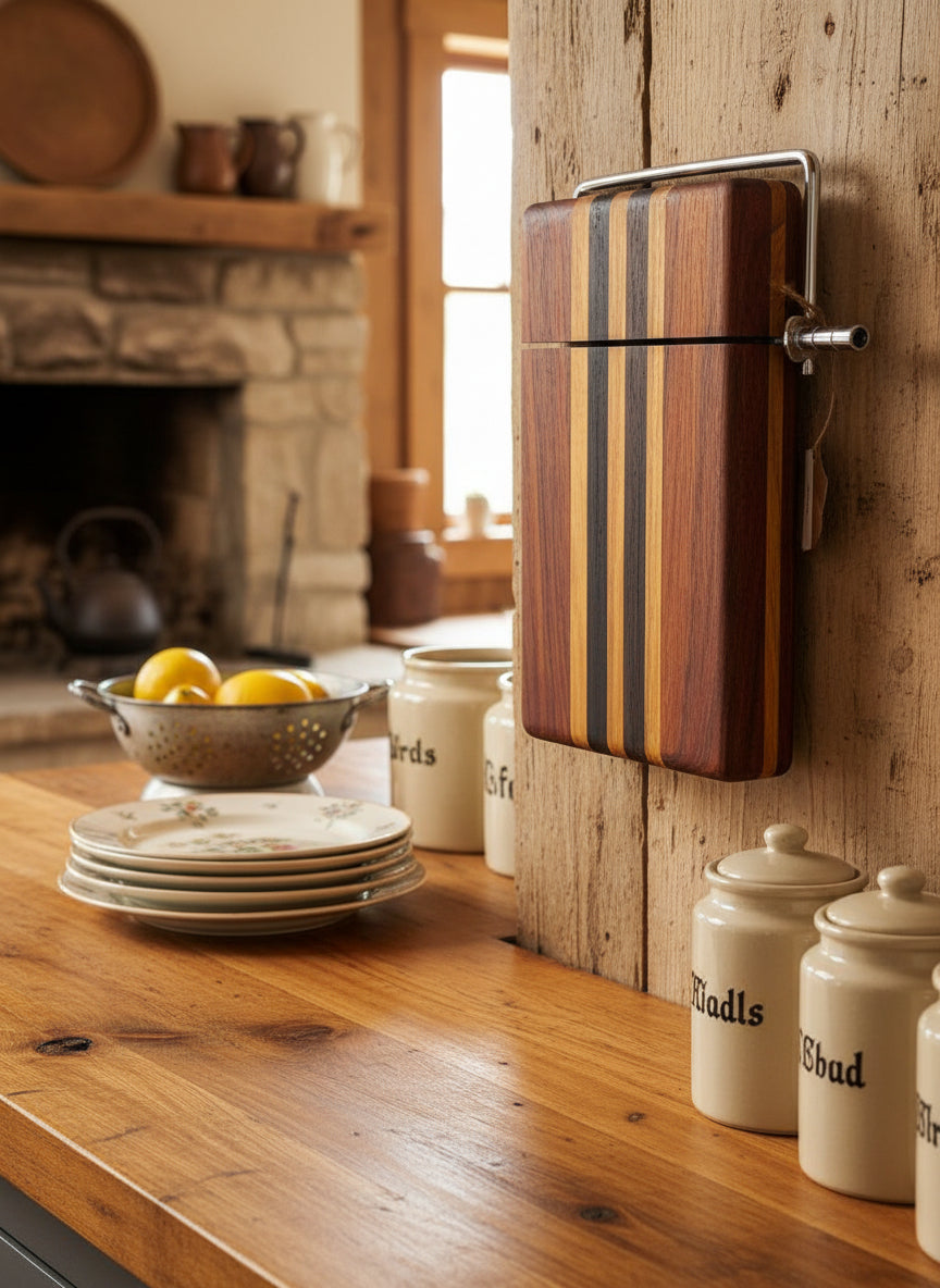 The fiery red of padauk, the golden warmth of canarywood, and the deep chocolate tones of wenge create a striking contrast that makes each piece a one‑of‑a‑kind functional work of art. Finished with food‑safe oils, this slicer blends artisan craftsmanship with everyday utility.