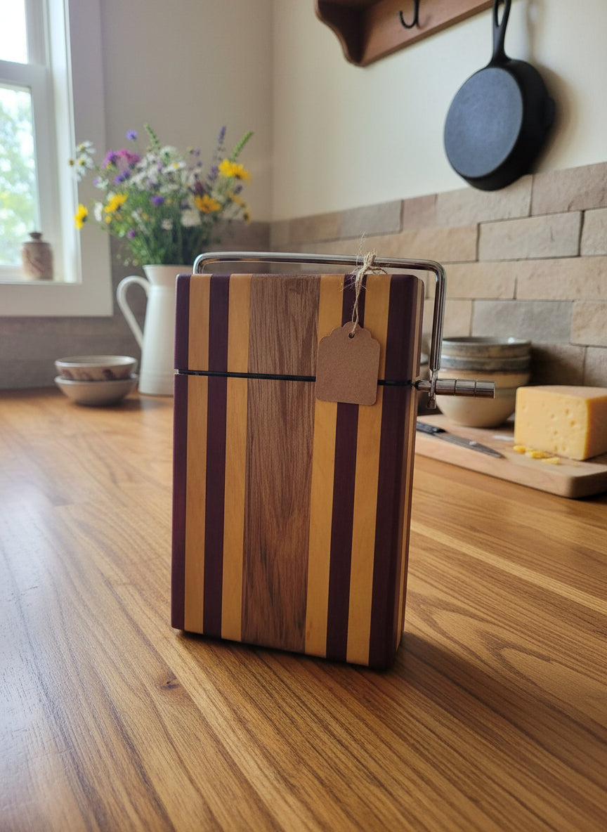 Handmade Cheese Slicer – Purpleheart, Yellowheart & Curly Maple (6" x 9")