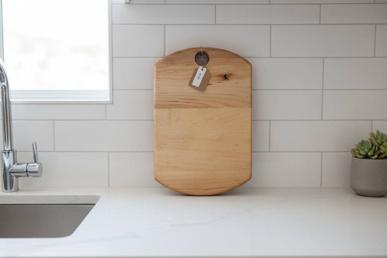The integrated hanging hole makes storage effortless — hang it on a hook, display it on a wall, or keep it within easy reach on your kitchen rail. Each board is shaped, sanded, and finished by hand with a food‑safe oil and beeswax blend that highlights the clean, bright maple grain.