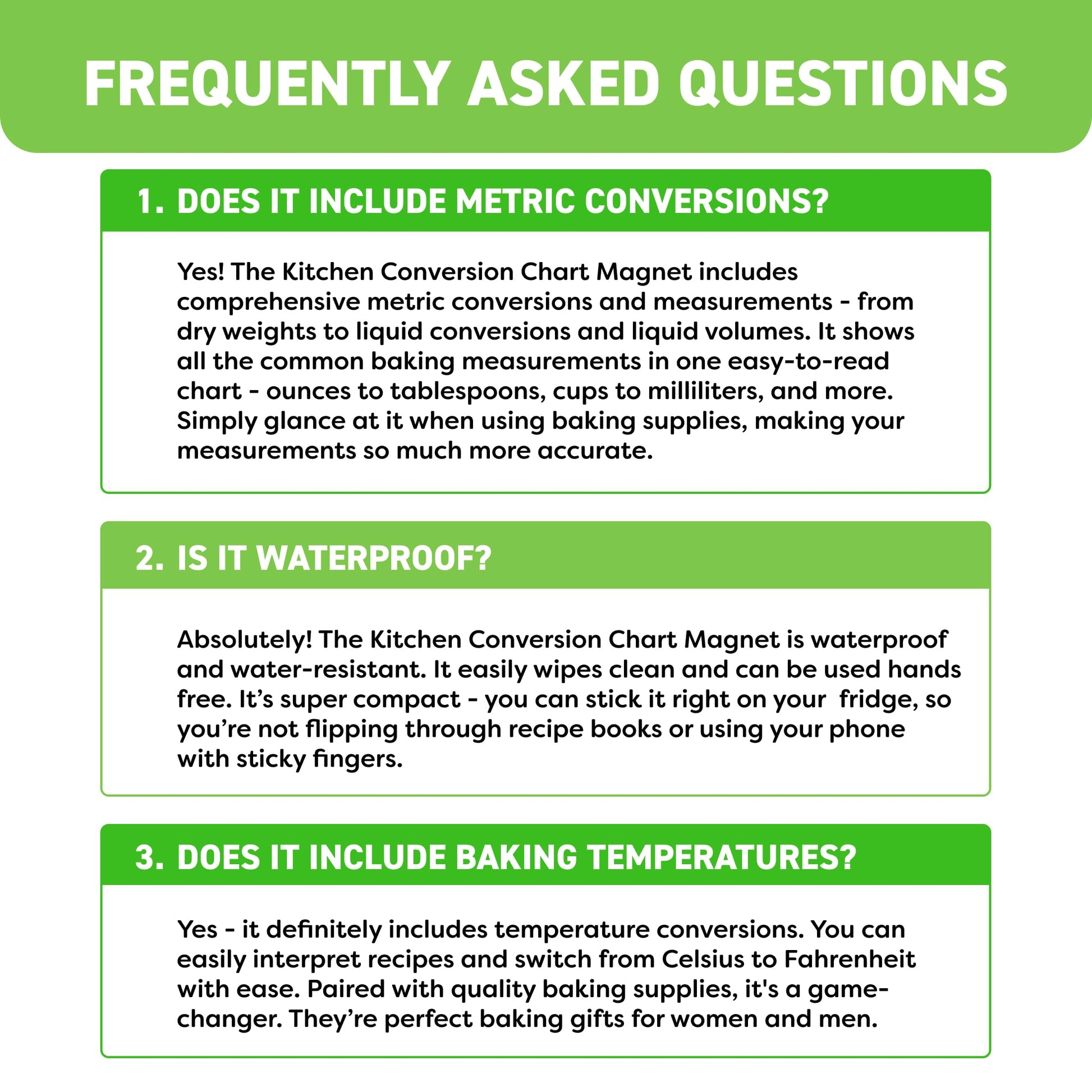 - Waterproof and Engineered for Durability. Water-resistant kitchen measurements magnet wipes clean with ease and stays firmly in place with a strong rubber backing. From home kitchens to culinary school labs, this conversion table chart streamlines measuring for cookies, cakes, and pastries. Made to assist your baking process while pairing effortlessly with mixing bowls and measuring spoons, it’s ideal for any baking gadget lineup.