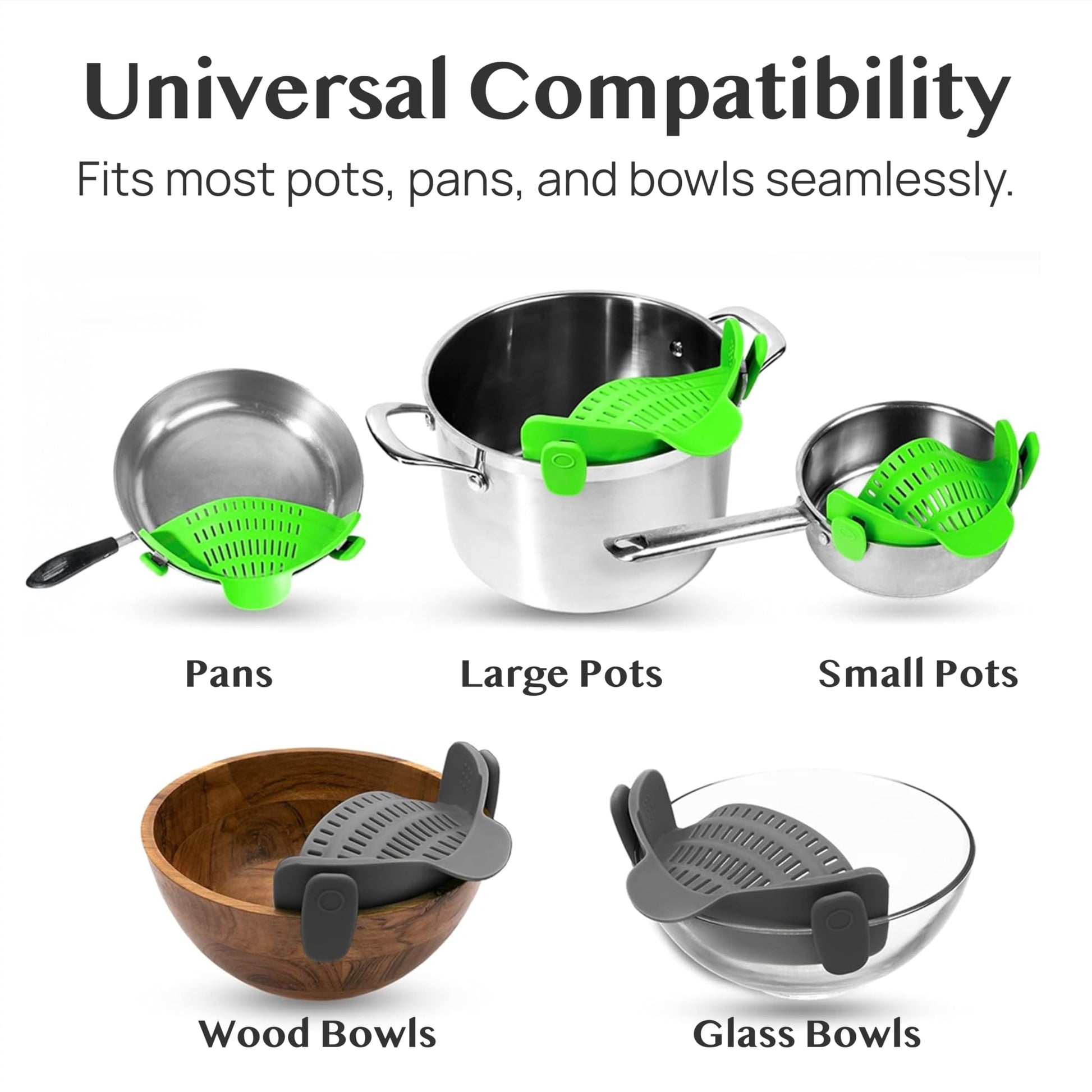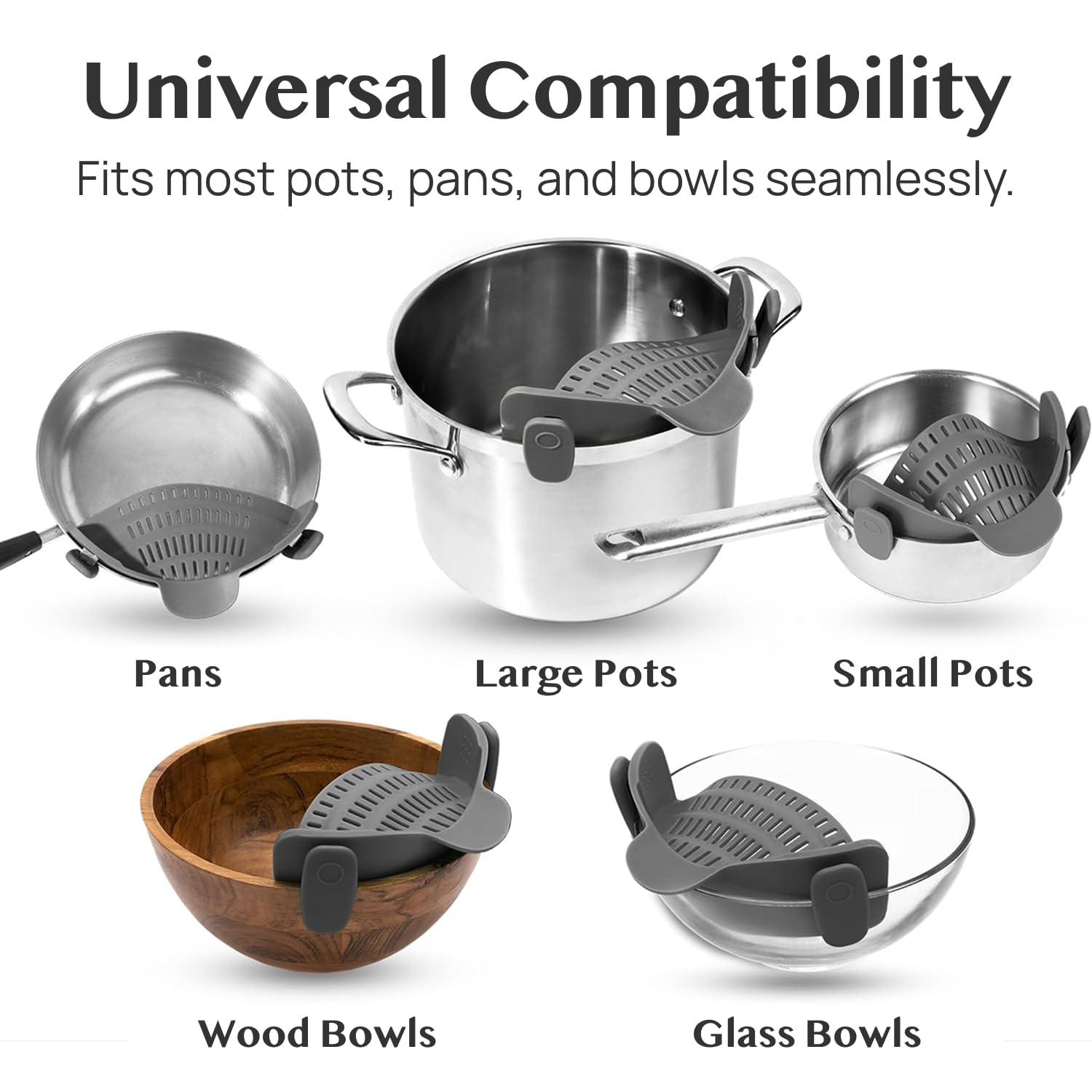 - Universal Fit: This clip-on pot strainer attaches to most cookware; fits small and large pots, pans, and bowls; suitable for daily use, on the go, or as part of your new home kitchen essentials