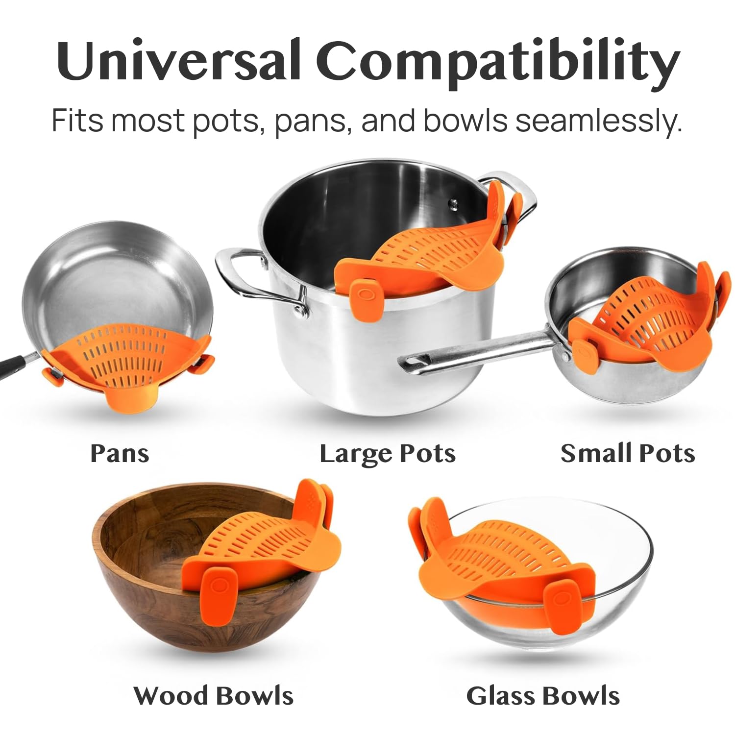- Heat-Resistant Silicone: Withstands temps up to 400°F (230°C); this durable clip on strainer grips securely when draining hot foods; a smart kitchen find that helps prevent spills and mess