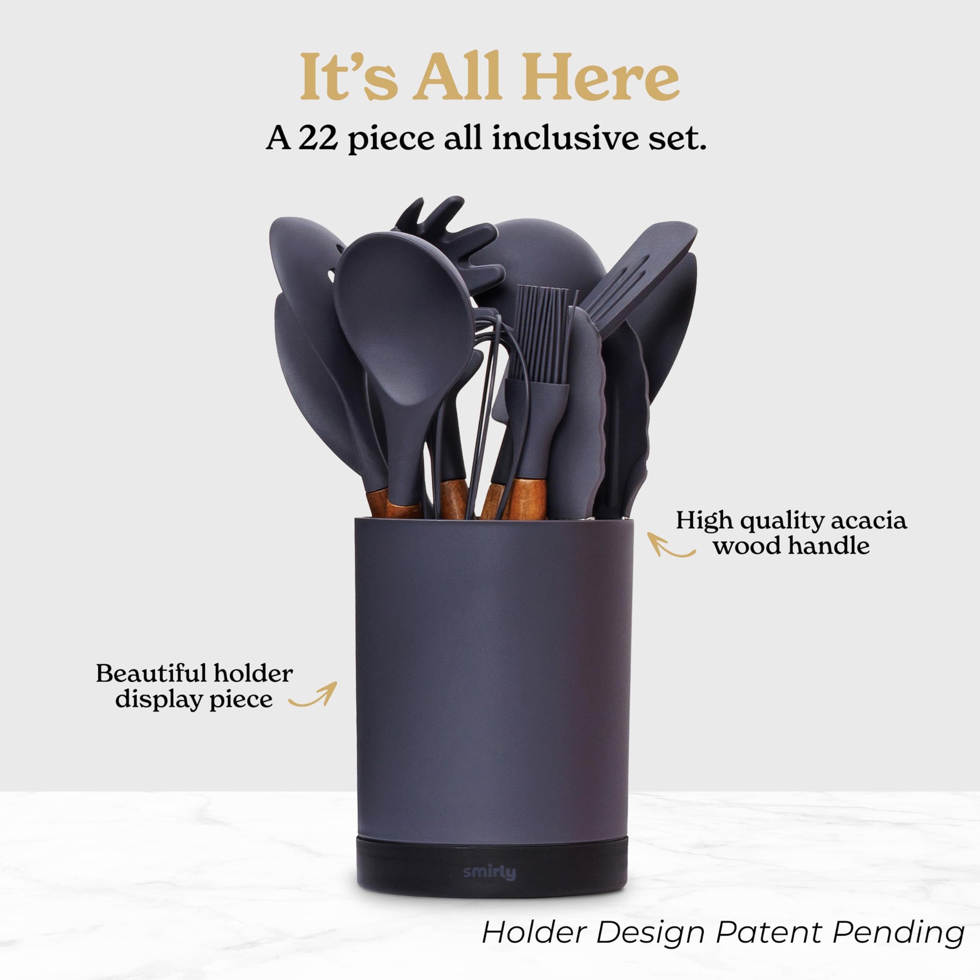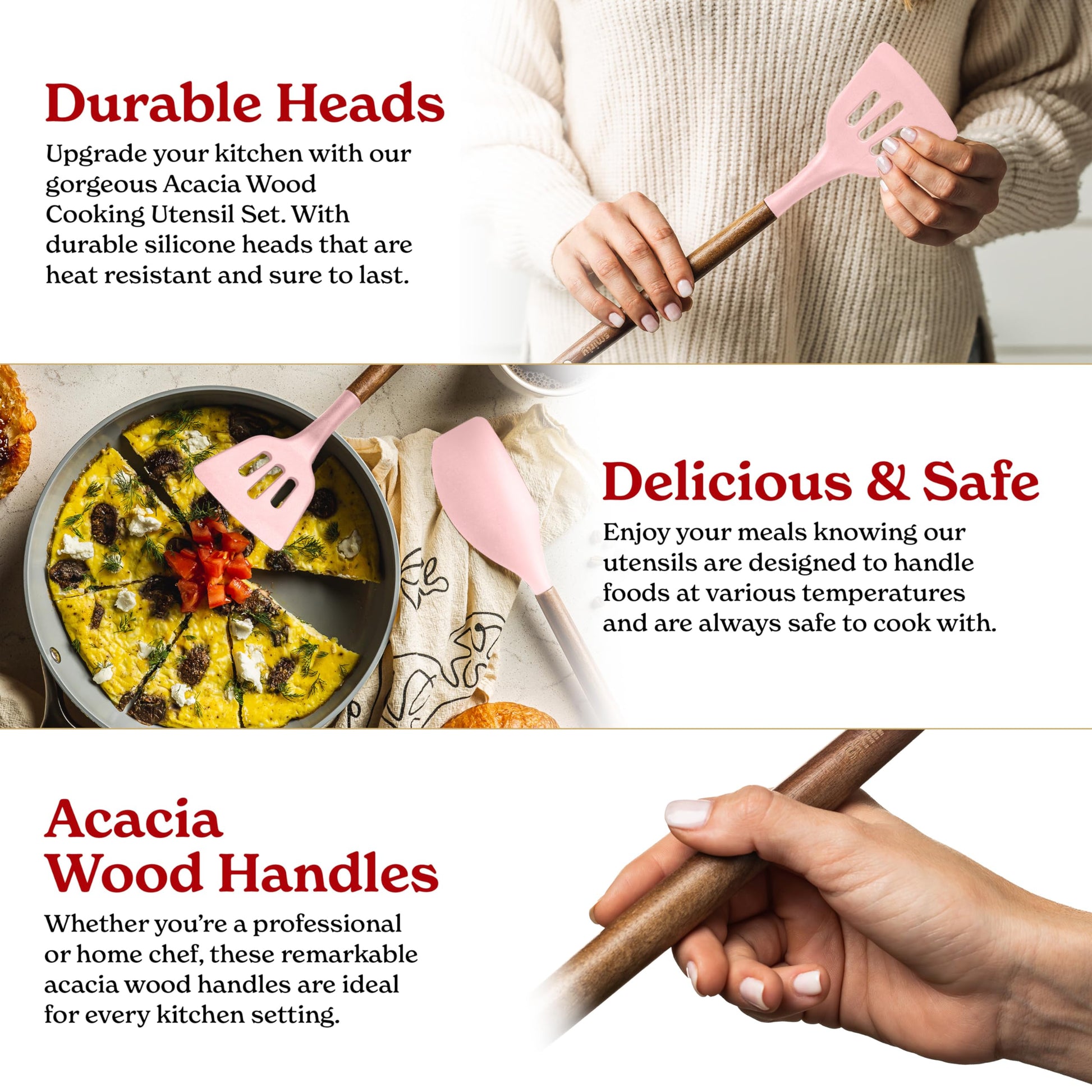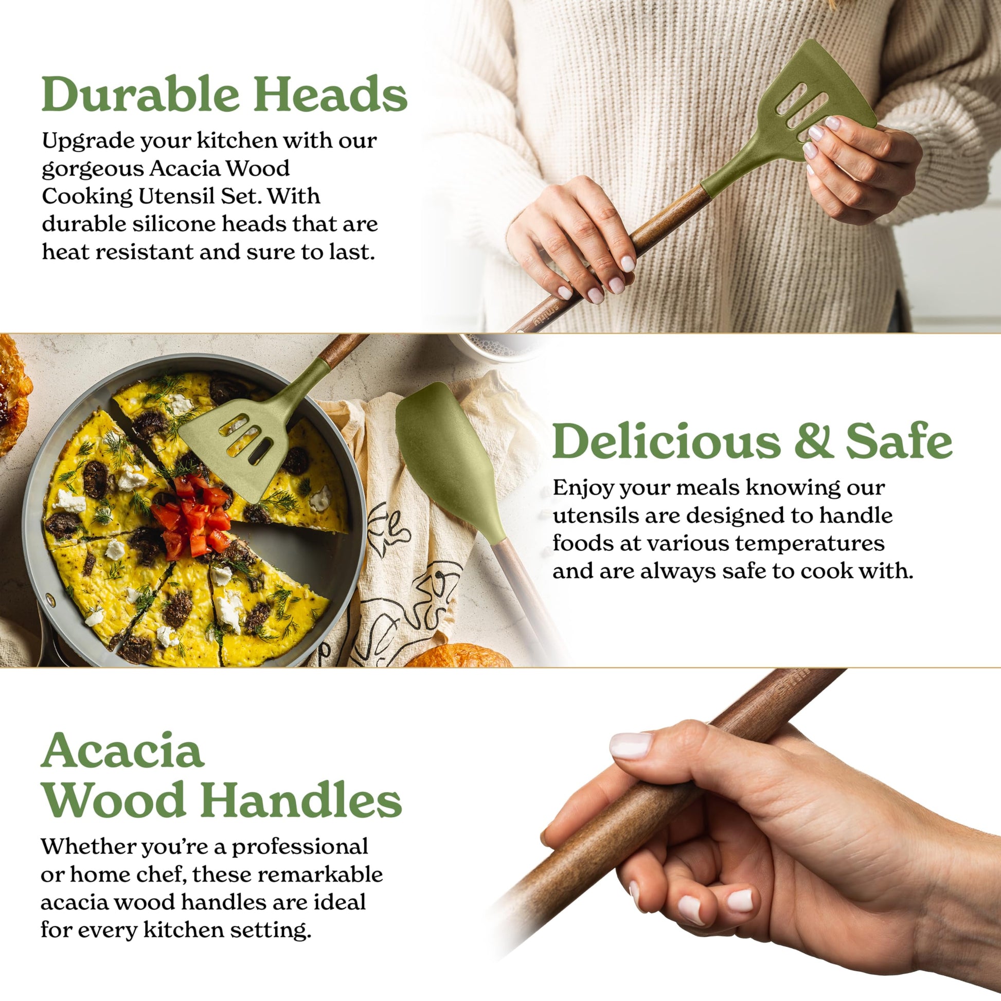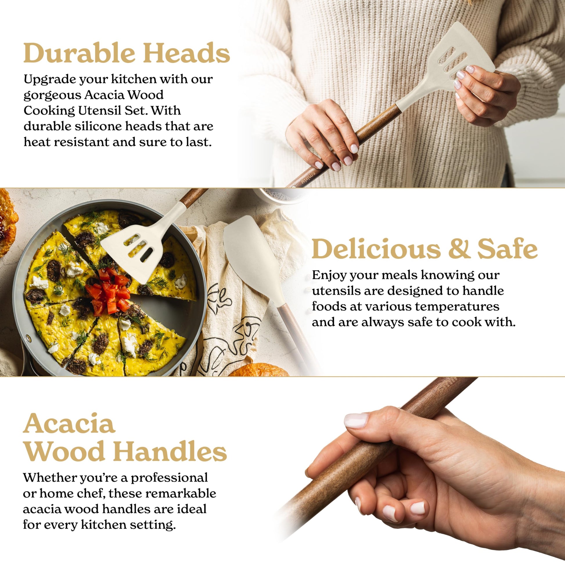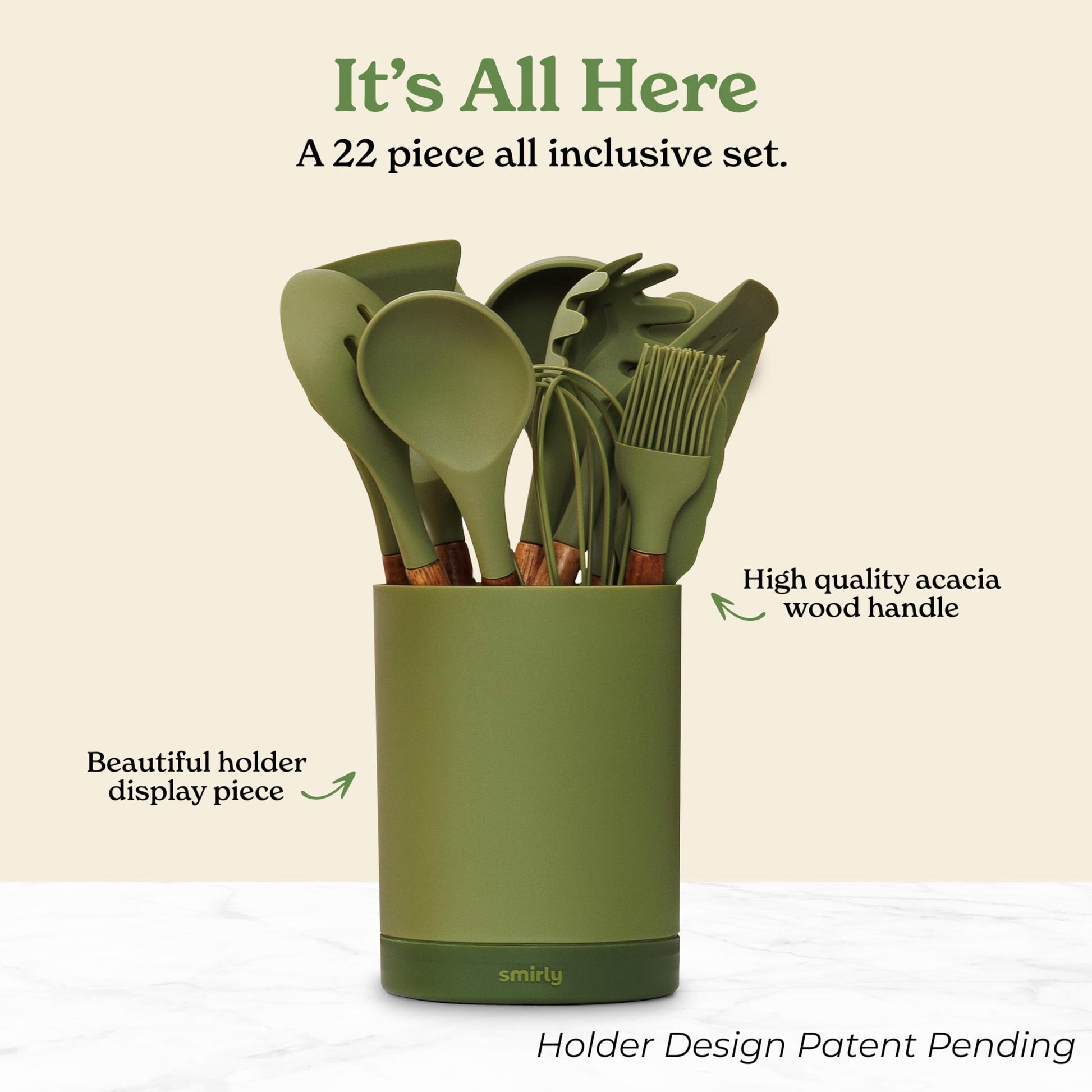 - ✅ Complete Your Kitchen - Our 22-piece, acacia wood handled, cream white silicone cooking utensils are professional level kitchen accessories and absolute household essentials. From everyday silicone spoons for cooking to whisks, tongs, and spatulas for nonstick cookware - you'll have a set of kitchen cooking utensils that will meet your every need.
