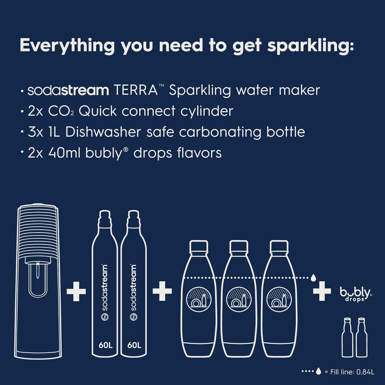 SodaStream - Terra Sparkling Water Maker | VALUE BUNDLE | CQC CO2 system | Includes 2x CO2 Cylinders, 3x 32 Fl Oz Dishwasher Safe Bottles, 2x Bubly Flavor Drops | Combine with Flavors | Misty Blue