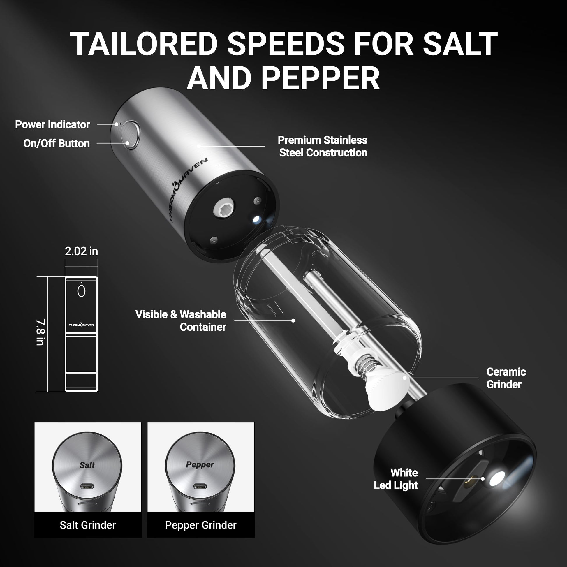 ThermoMaven Electric Salt and Pepper Grinder Set, 110ml Larger Rechargeable Automatic Salt and Pepper Mill Grinder with 6 Adjustable Coarseness, Electric Salt and Pepper Shakers, LED, 2 Packs, Black