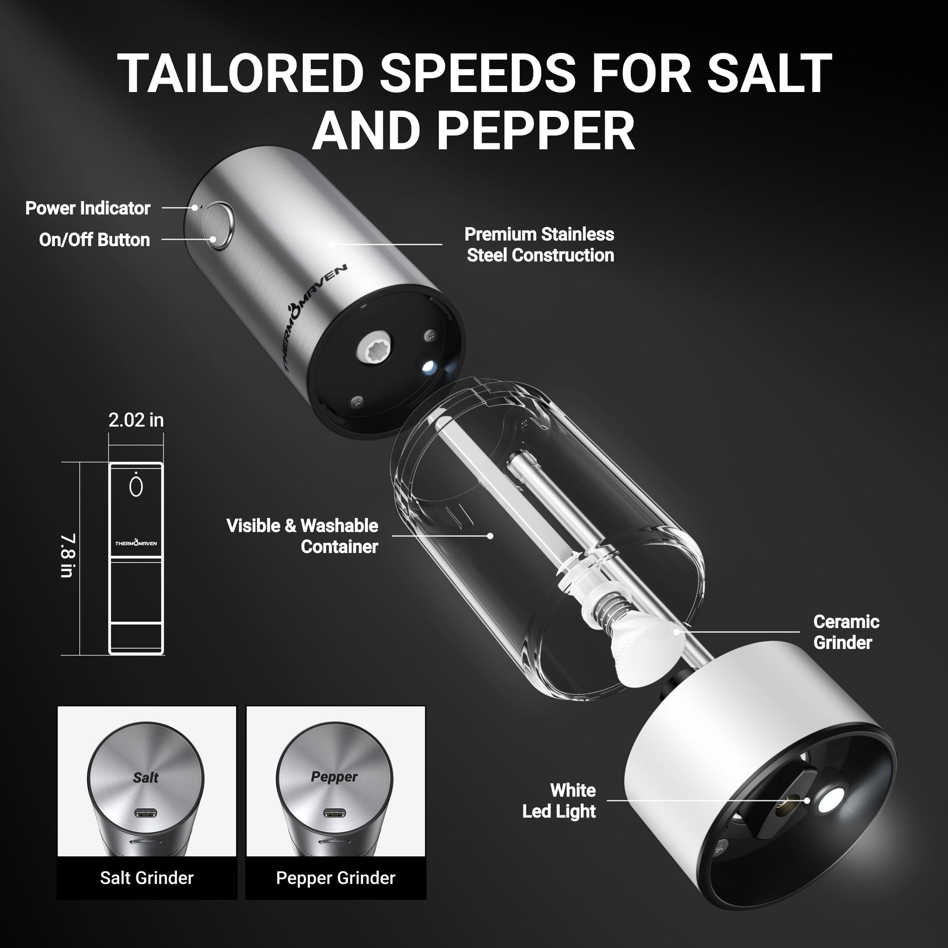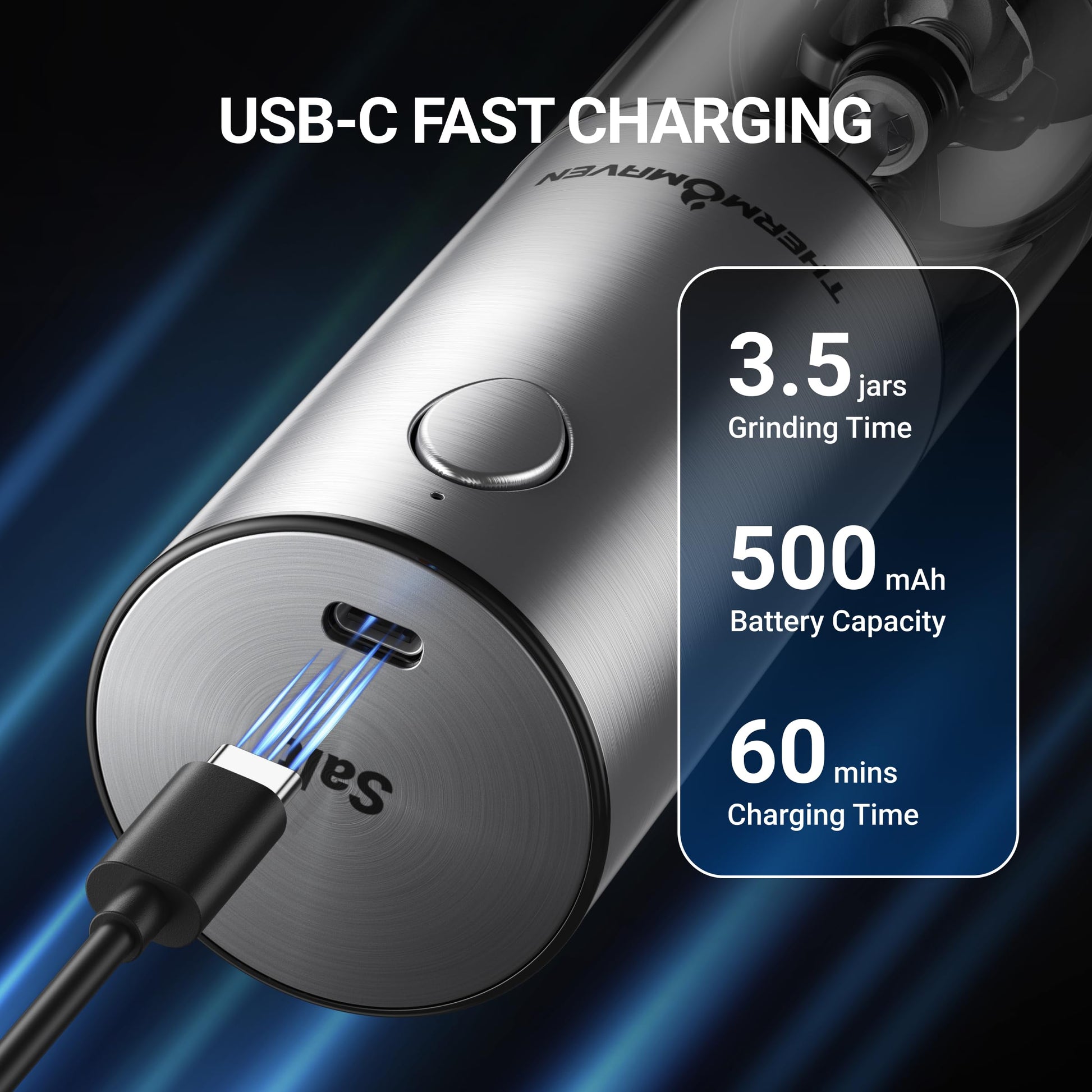 - Rechargeable Design: Our ThermoMaven Rechargeable Salt and Pepper Grinder Set comes with two Type-C charging cables that allows for quick and convenient recharging. With just one charge, you can use the grinder for a month's daily use, making it a cost-effective and environmentally-friendly choice.