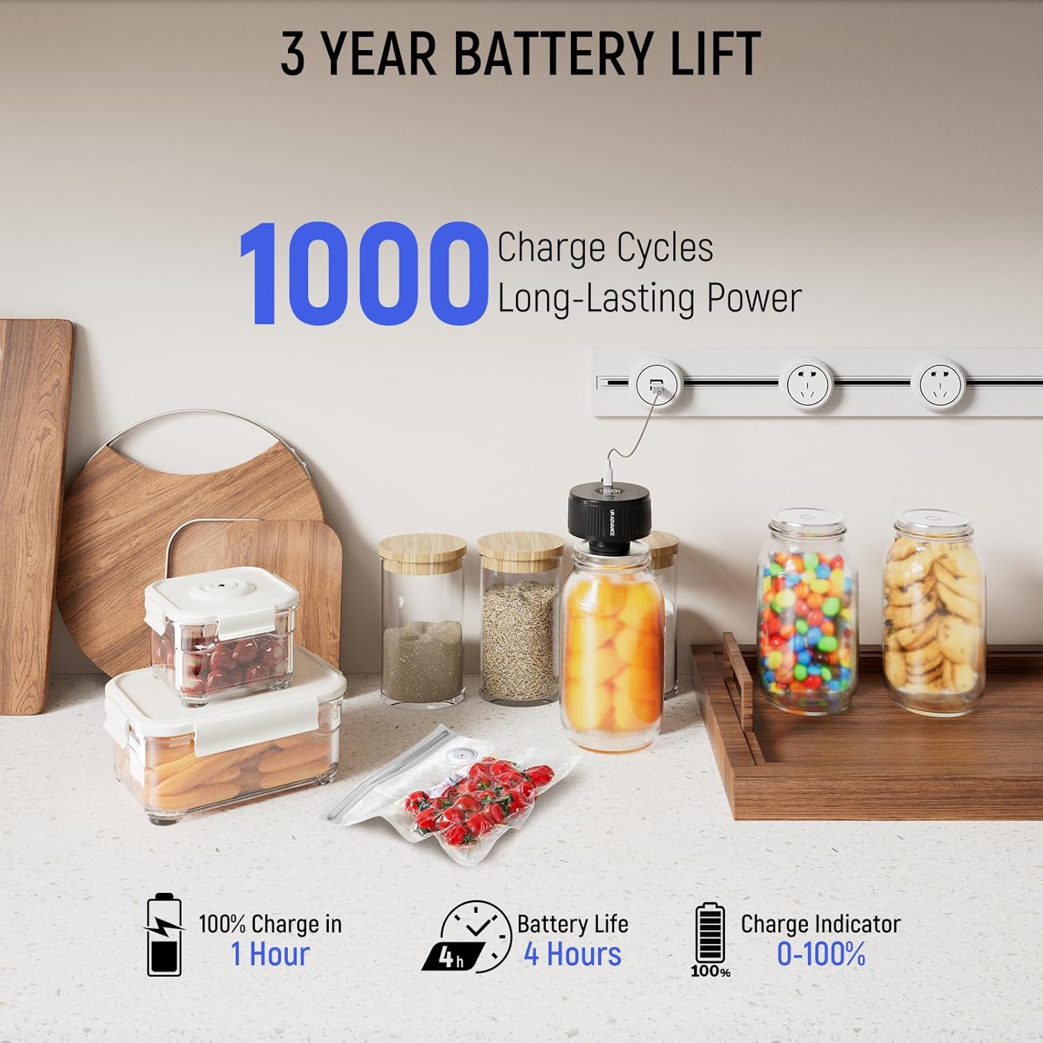 - 【Long Lasting Battery Performance, Seal Anywhere】Engineered for total portability, this canning jar vacuum sealer is cordless and ultra-lightweight (just 5.8oz). A single 1-hour USB-C charge delivers a 4-hour runtime for over 250 seals. Achieve a perfect seal in seconds: Mason jars (8-15s) | Bags (7-12s) | Vacuum Containers (12-20s). Built to endure 1,000+ cycles, it's your reliable companion for camping, travel, and daily use for years to come.