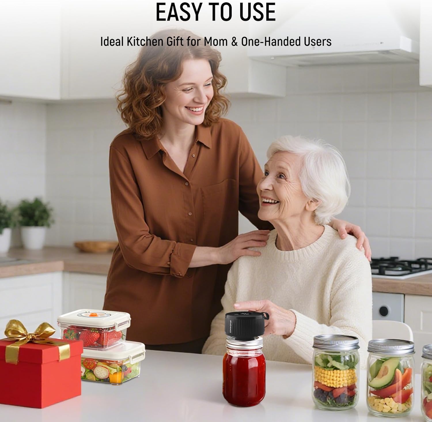 - 【Complete Kit & Perfect Gift for Mom】Includes 1 x electric canning jar vacuum sealer, 1 x Charging cable, 10 x Reusable wide-mouth jar lids, 10 x Reusable Regular jar lids, 1 x Lid opener tool, 2 x vacuum sealer bags, 1 x user manual, 1 x slider clip. Lock in freshness for fruits, dry goods and more—preserve flavor, slash waste with our jar vacuum sealer kit.