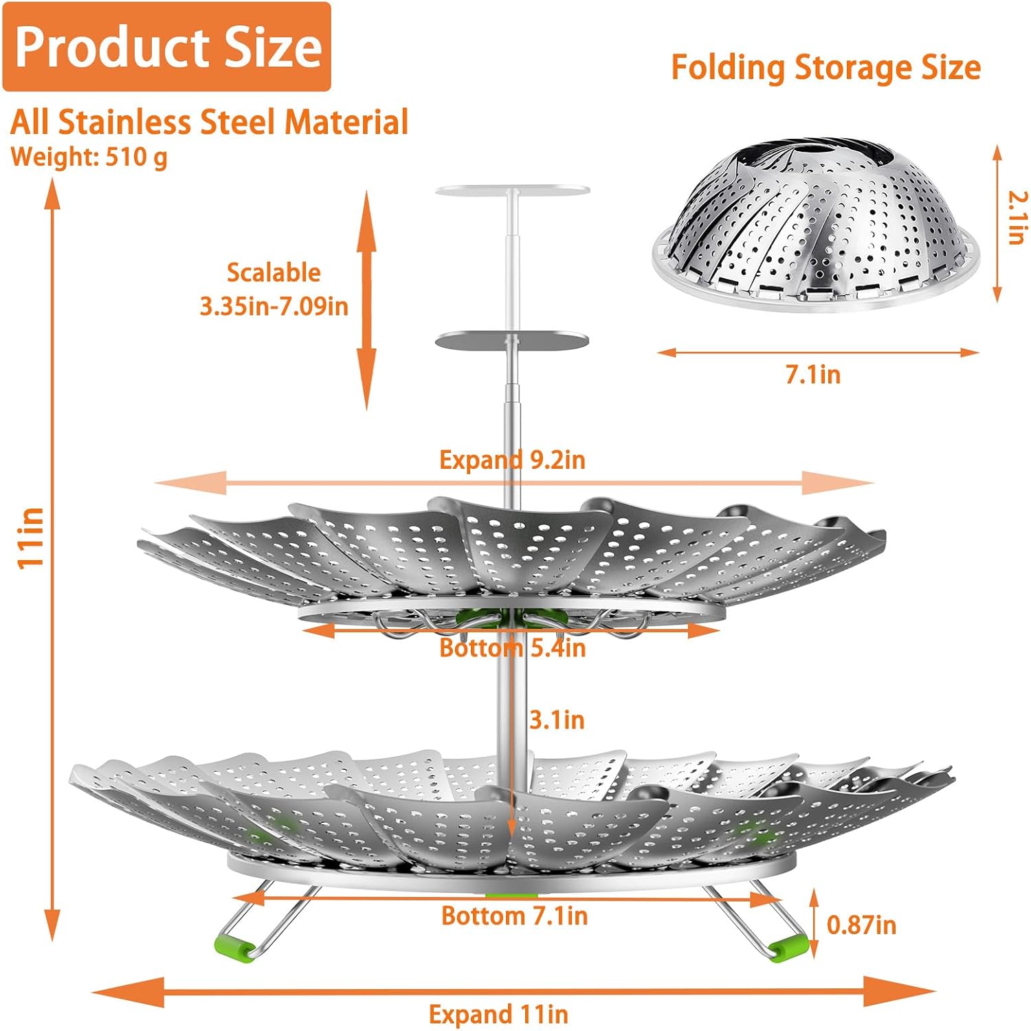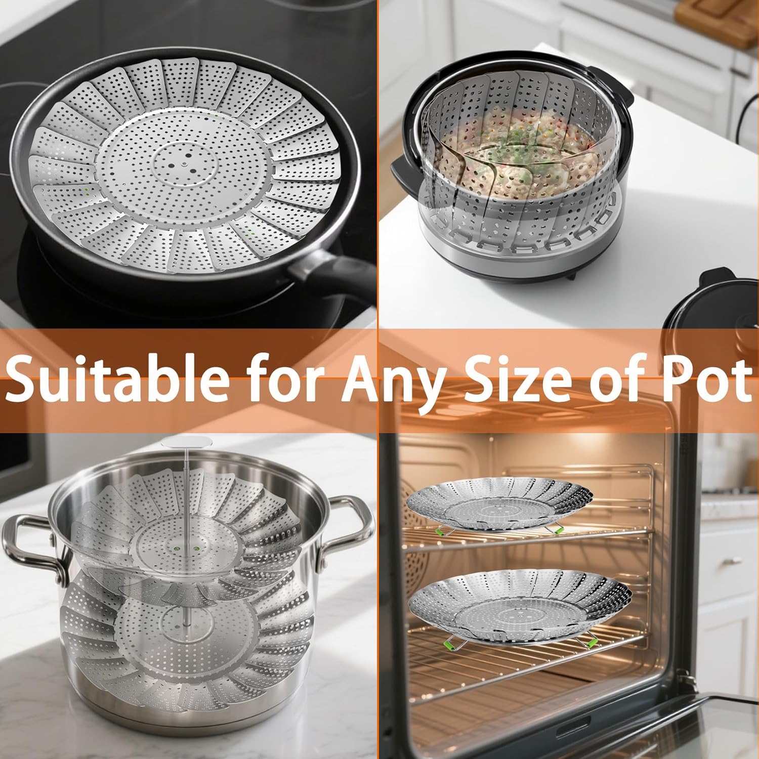 - SIZE FIT ANY POT:Our stretchy steamer basket opens like a flower to 11 and 9.2inches wide. It works as a steamer pot helper that sits inside nearly all pots or pans. After cooking, this clever steamer basket for pot folds small to hide away easily