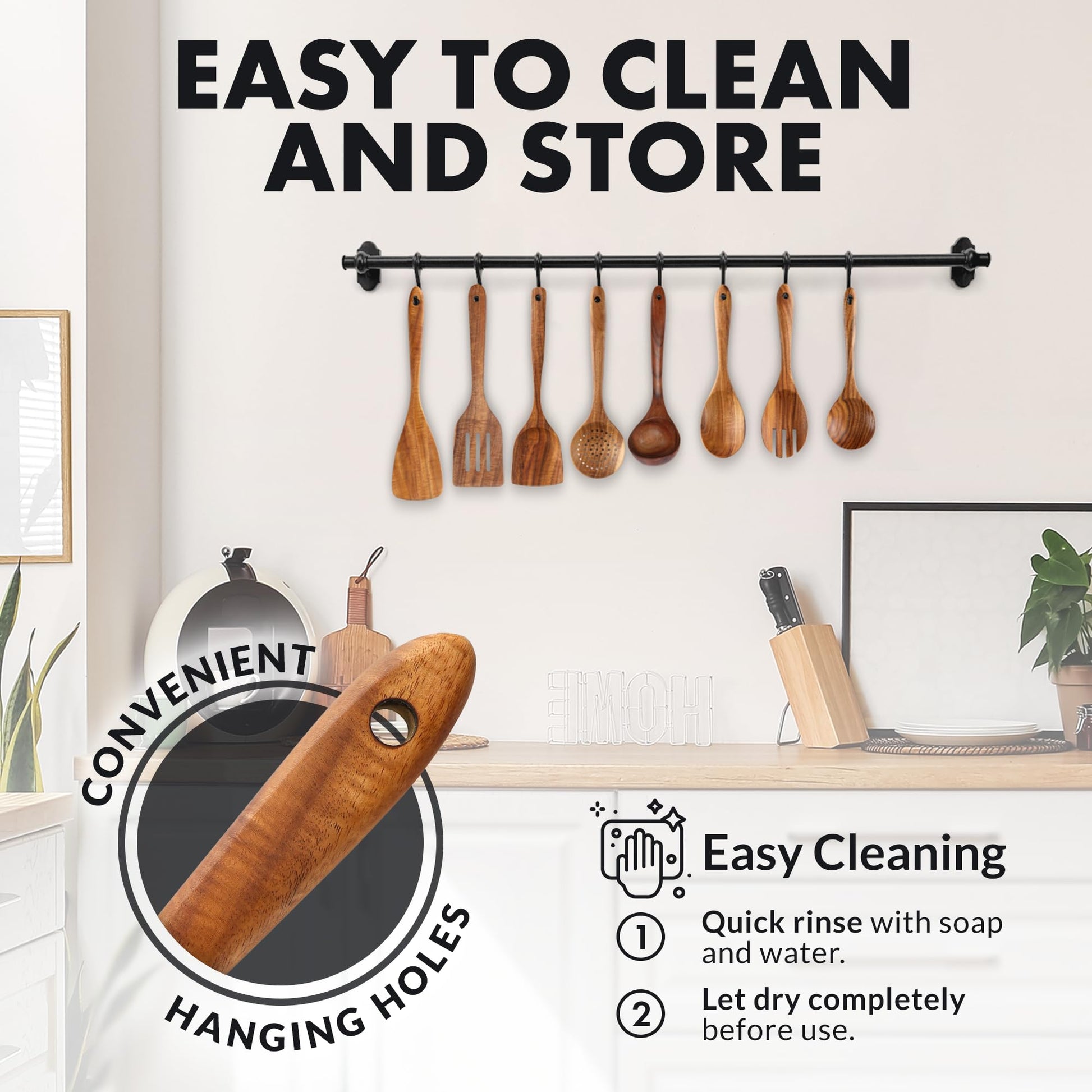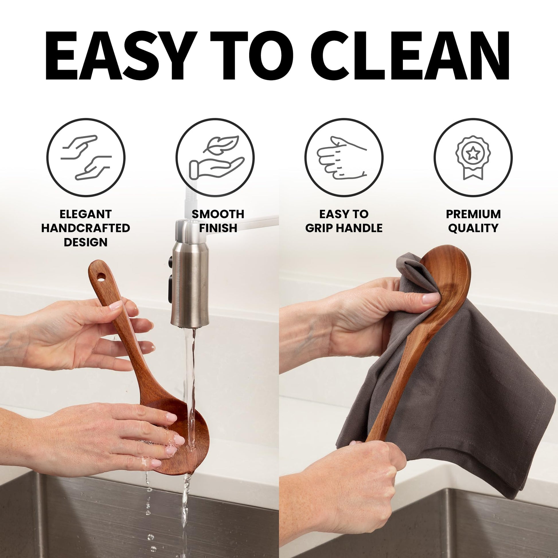 - EASY TO CLEAN, EASY TO STORE: Made from water-resistant teak wood, this small wooden cooking spoon is built to last. Simply hand wash with mild soap, rinse thoroughly, and air dry. The polished lacquer finish helps maintain its smooth texture and elegant appearance.